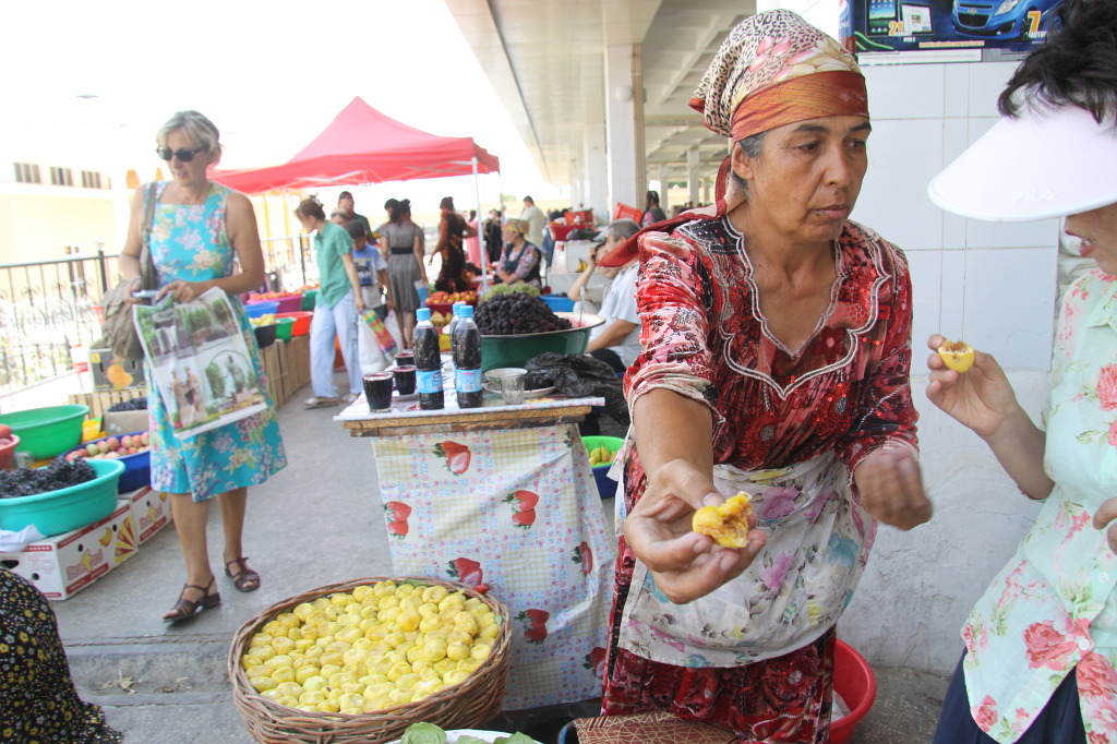 성미양으로 부터 3일간 유효하다는 입장표를 얻어 잘 구경했다. 내부 보다는 외관이 더욱 멋지다. 초록색과 흰색셔틀 미니버스가 비비하늠 앞을 왔다 갔다 한다. 10여명이 내리고 또 탄다. 현대식 모습이다. 길은 타일로 깔끔하게 만들어져 있다. 나무 그늘에 앉아서 오가는 사람들을 보다가 옆에 있는 재래시장으로 갔다. 이 시장의 이름은 시욥 바자르 이다. 비비하늠보다 더 재미있다. 견과류를 파는 곳에서는 한국말을 잘 하는 중년 남성도 만났다. 건포도가 여러 종류로 나뉘어 자루에 나란히 담겨있다. 가격이 모두 다르다. 생산 년도 별, 종류별로 나뉜 것 같다. 내가 보기에는 모두 같아 보인다. 포도꼭지에 붙어있는 줄기를 보고 뭐라고 설명해 주는데 알 수 없다. 오디 쥬스를 한 잔 사서 마셨다. 생각보다 시다. 공짜로 맛을 보라는 무화과는 익힌 것 인데 무척 달고 부드럽다. 무엇보다도 딘야가 제일 좋다. 일종의 긴 메론인데 우리나라에도 개인이 2개까지 반입이 허락된단다. 외국인들도 제법 많다. 채소를 파는 곳은 온통 채소들이다. 정육, 공산품 등 모두 종류별로 시장이 분류되어 있다. 시장은 살아있어, 언제 방문해도, 어떤 시장을 가도 즐겁다.