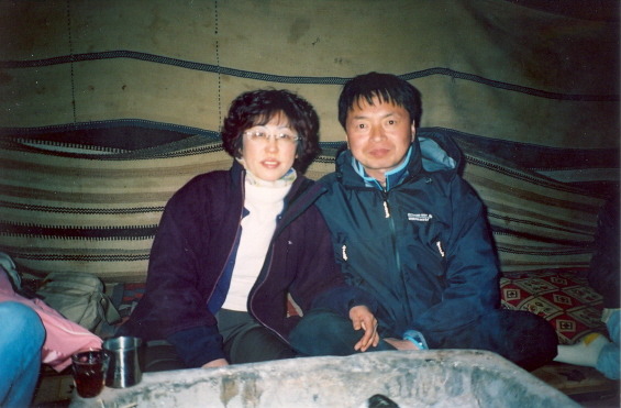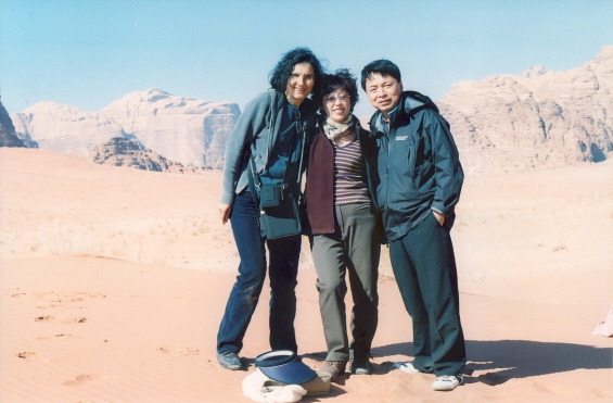 해가 지는 와디럼은 정말 아름답다. 푸른색이 감돌고 흰빛과 붉은 빛이 섞여 바위와 어우러져 연출하는 저녁 빛은 환상적이다. 길게 그림자가 늘어지고 바람이 불며 제법 춥다. 텐트 속에 들어와 모닥불을 피우고 뜨거운 차를 마신다. 호주인 커플과 함께 카드놀이를 한다. 훌라 게임 방식이 서로 달라 설명해 주고 카드를 하니 시간가는 줄 모르고 재미있다. 희미한 가스 불 아래에서, 모닥불 온기에 추위를 달래며 놀자니 배가 고프다. 드디어 저녁식사다. 어디서 만들었는지(나중에 알아보니 뒤에 주방 시설이 간단히 되어 있다)통닭에 밥을 섞어서, 토마토, 오이, 야채종류를 섞여있는 반찬이 등장한다. 아이란 1개와 함께 저녁 식탁이 마련되었다. 어두운 불빛 아래서 접시에 담아 맘껏 먹었다. 이것이 베드윈들의 식사란다. 느끼한 맛이 있어 우리가 갖고 간 초장과 깻잎을 꺼내서 함께 먹으니 환상적이다.