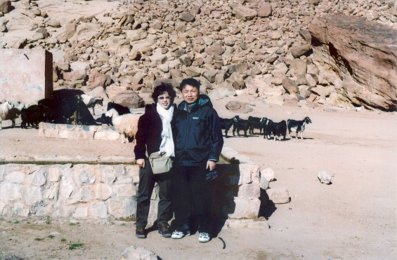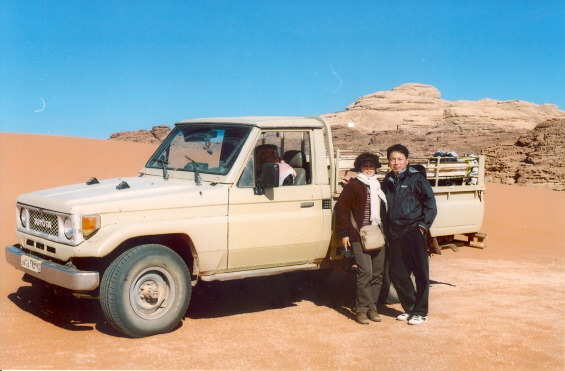 잠시 후 디팔라(Difalha)라는 운전기사 겸 가이드가 왔다. 우리는 작은 트럭 뒤에 올라탔다. 지프가 아닌 작은 트럭이다. 사륜구동이고 흰색 중고 도요타 차다. 모두 9명이 타니 가득 찬다. 트럭은 조그마한 구멍가게에 가서 음식을 산다. 또 주유소라고도 할 수 없는 연료 가게에서 연료를 사고 마을을 빠져 나오니 사막이다. 트럭 뒤에 타고 달리니 시원하다. 마을이 엄청 멋있는 바위산으로 둘러쳐져 있어 주변 경관이 멋지다. 마을이 멀어져 간다. 5분정도 달려서 커다란 바위산 아래 도착했다. 검은 색 텐트가 하나 있고 동물들이 물을 먹을 수 있도록 시설이 만들어져 있다. 이곳이 로렌스 스프링이다. 호수로 이어져 있는 산중턱에 샘물이 있단다. 돌산이라 위험했지만 사막에, 그것도 풀 한 포기 없는 커다란 바위들로 만들어진 돌산에서 물이 나오다니 믿겨지지 않는다. 확인하기위해 조심스럽게 산을 올라갔다. 숨이 차고 땀이 난다. 이 바위 저 바위를 건너며 길도 없는 바위산의 목표를 확인하며 올라가니 바위틈에서 물이 나오고 물이 고여 있다. 초록색 풀이 주변에 자라고 초록색 이끼가 고인 물에 자리고 있다. 언제 올라왔는지 다양한 무늬를 가진 염소들이 물을 마시고 있다. 참 신기하다. 이곳은 모든 것이 신기하고 새롭다. 사람들의 모습, 붉은 빛 모래, 우뚝 솟아있는 거대한 바위산들, 암반에서 솟아나는 샘물. 물을 보다 아래를 내려다보니 그 경치가 너무 멋지다. 바위산과 어우러진 멋진 풍경이 한동안 내 시야를 고정시킨다. 고등학교 학창시절에 처음 보았던 인상적인 사막 장면이 드디어 눈앞에 있는 것이다. 데이비드 린이 감독한 영화, 피터 오툴, 앤소니 퀸, 오마샤리프 등이 등장하는 영화 ‘아라비아 로렌스’의 멋진 풍광이 이곳이다. 정말 멋진 경치다. 샘 아래에는 무화가 나무 한 그루가 자라고 있다. 일행이 있는 산 아래로 조심스럽게 내려갔다. 꼬마들 셋이서 옆 바위산에 올라간다. 더우니 잠바를 벗어 던져놓고 놀다가 찾지 못해 어른들이 올라가 찾는다고 난리다. 베드윈 검은 텐트에 들어서니 낯선 총각이 차를 한 잔 준다. 달콤한 홍차가 맛있다. 모닥불 위에 검게 그을은 주전자에는 뜨거운 차가 끓고 있다. 조그만 판자위에는 어디서 채취했는지 예쁘게 생긴 검은 색 돌을 올려놓고 팔고 있다. 철광석인 것 같다. 잠바도 찾고 일행이 모두 모여 다시 트럭을 타고 달린다.