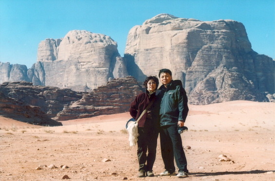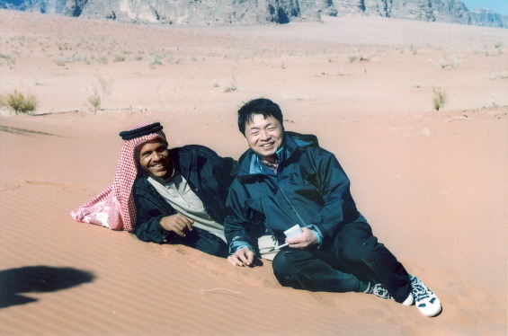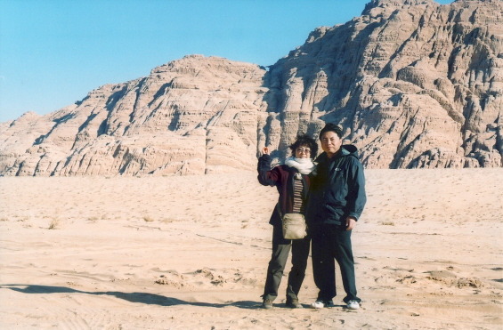 직선으로 곧게 뻗어 있고 주변 경관이 황량해 볼 것이 별로 없고, 음악도 고음으로 신경을 마비시키고, 차는 몸을 적당히 흔들어주고....... 아내도 꼬마들도, 모두 잔다. 한참을 달리다가 왼쪽으로 돌아 좁은 길로 들어선다. 첩첩의 돌산들이 시야에 들어온다. 허허벌판에 현대식 건물이 세워져 있다. 차가 그 앞에 멈춘다. 와디럼 방문센터다. 입장료를 끊어오란다. 매표소에 가서 두당 2D씩 7 명분을 끊었다. 이곳에 오니 와디럼에서 하고 싶은 투어의 종류가 잘 안내되어 있다. 이곳이 공공기관에서 운영하는 정식 투어센터였다. 우리는 이곳에 도착하기 전 버스 차장과 투어에 대한 흥정을 이미해 놓았다. 가이드, 저녁식사, 지프(오전, 오후)저녁 캠프(담요제공), 입장료 포함해서 성인 20D, 아이들 10D에 약속하고 선불로 40D를 주고 끝나고 70D를 주기로 메모지에 써가며 약속을 했다. 이런 사전 정보교환이 없는 사람들은 이곳 와디럼에 방문센터에서 입맛에 맞게 투어를 선택하는 것도 좋을 것 같다. 외국인을 상대로 하는 것이라 약간 비싼 게 흠이다. 우리 버스는 다시 달려 사막 내에 자리 잡은 민가에 도착했다. 도로도 차도 지붕도 사람들도 온통 모래다. 8시 30분에 도착했으니 두 시간 걸린 것이다. 제법 먼 거리다. 버스 차장의 형님 집이라고 하지만 서로 동업관계 인 것 같은 집으로 들어갔다. 모닥불이 피어있는 모래밭에 둥글게 앉아서 대접해 주는 차를 한 잔 마셨다. 페트라에서 같이 버스를 타고 온 크로아티아의 수학 선생님인 라티카 아주머니와 그의 아들 4학년 마티야스와 함께 투어를 하게 되었다.