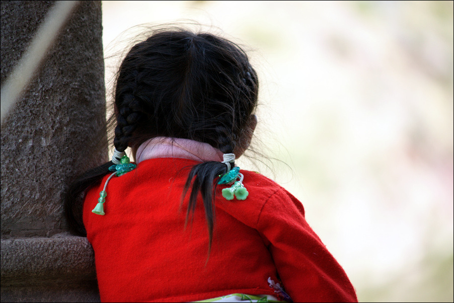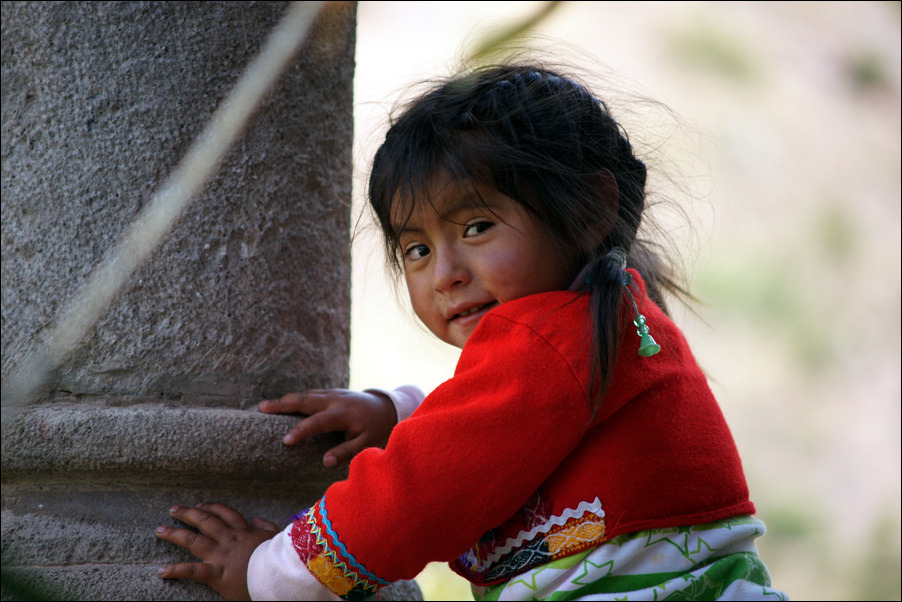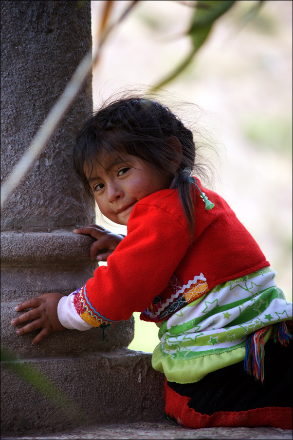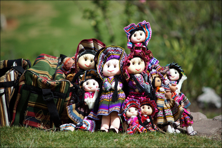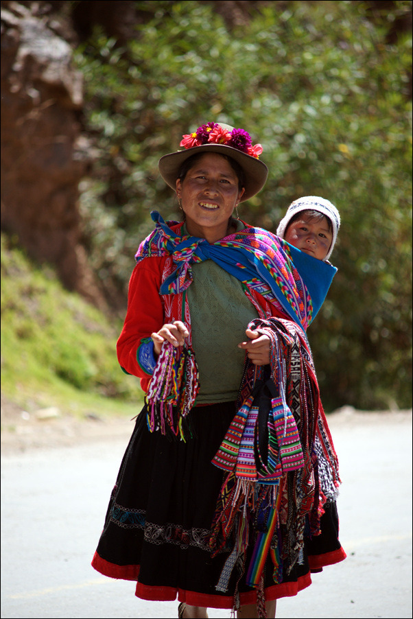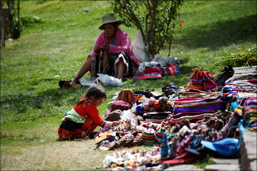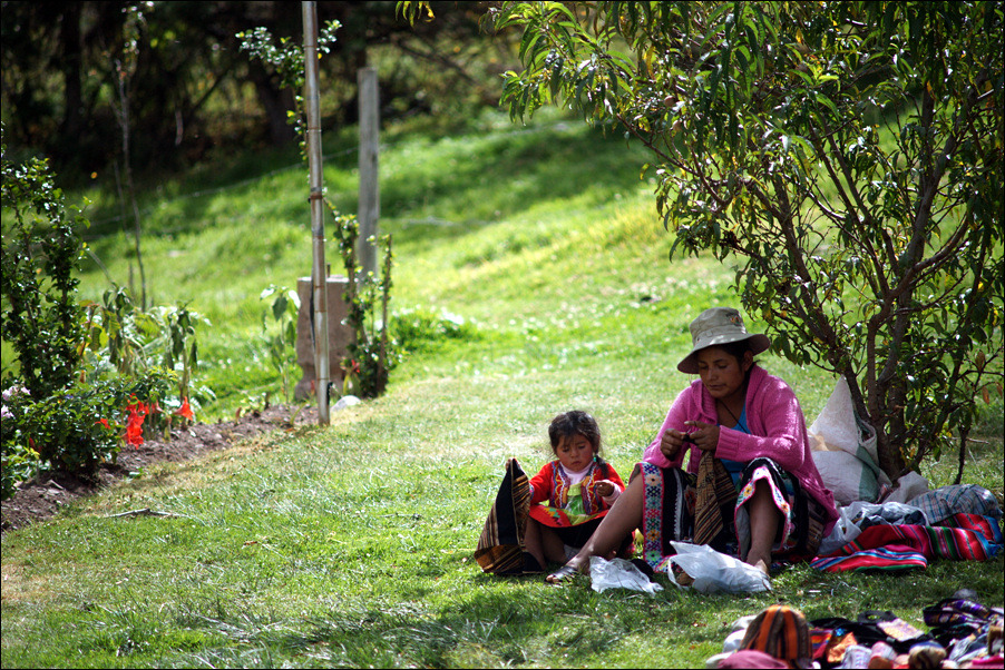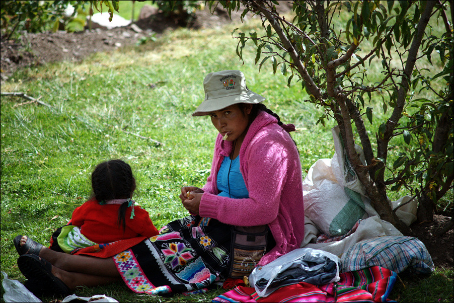 바깥에서 기념품을 팔고있는 인디오 모녀.