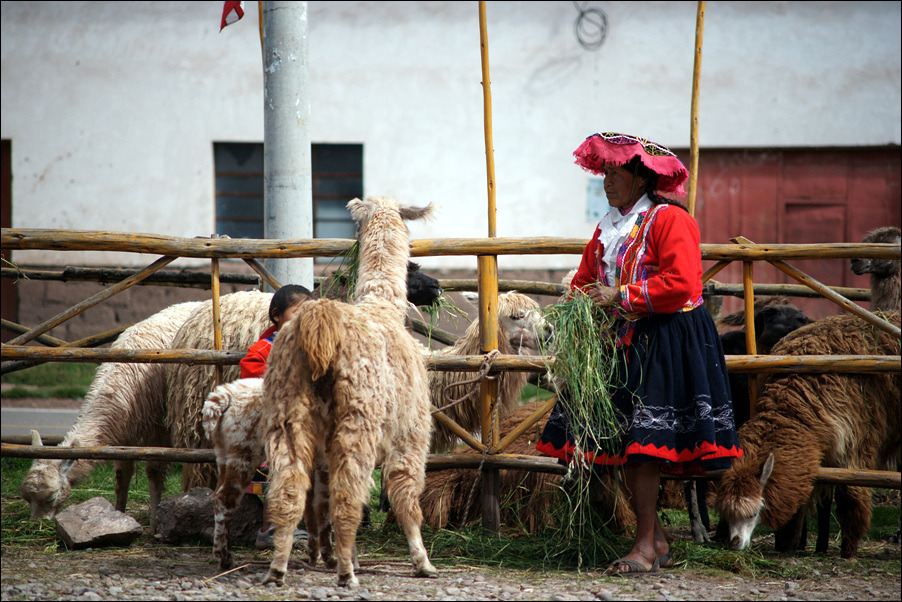 인디오 의상을 입은 여자들이 알파카를 앞세워 관광객과 사진 모델을 해 주고 돈을 받는다.