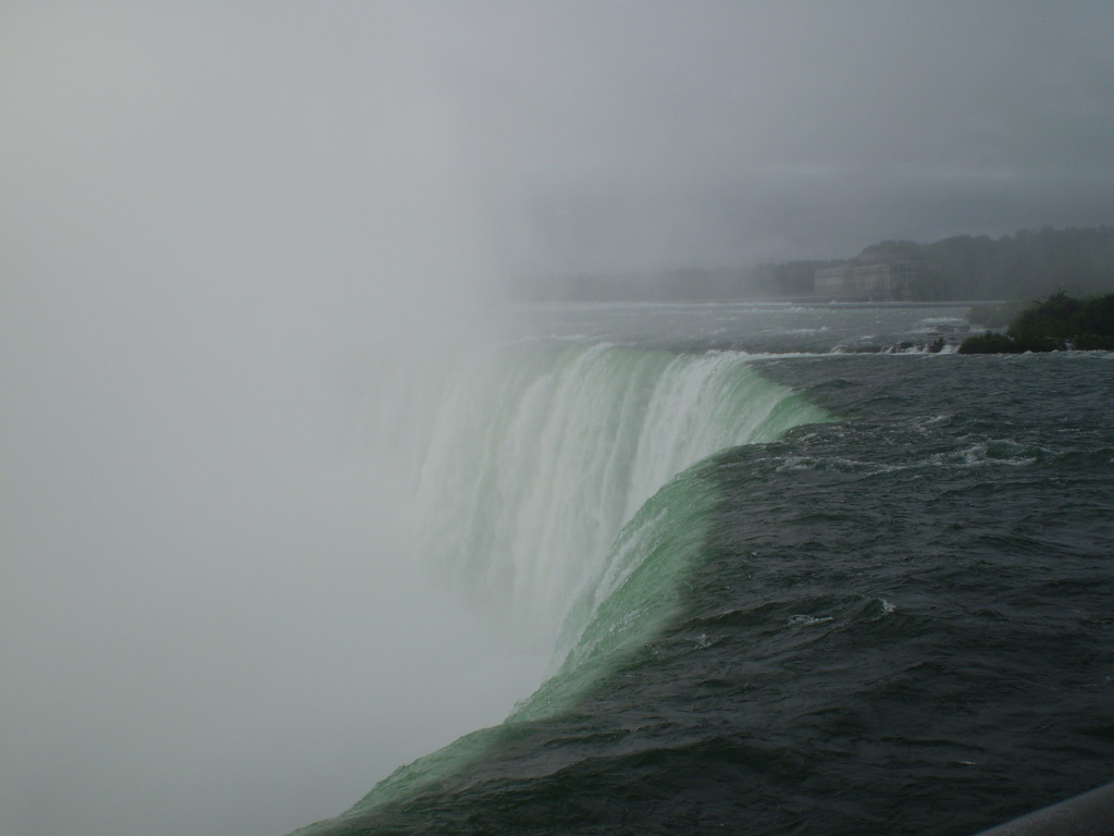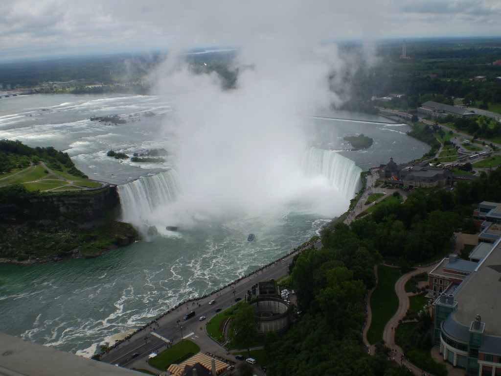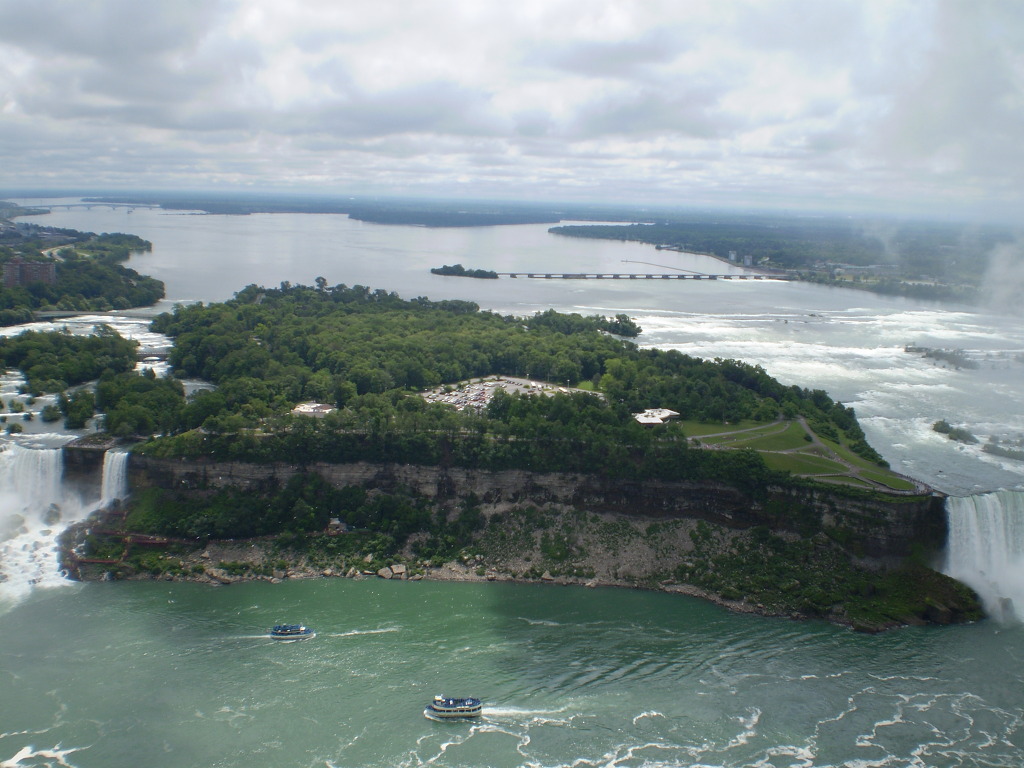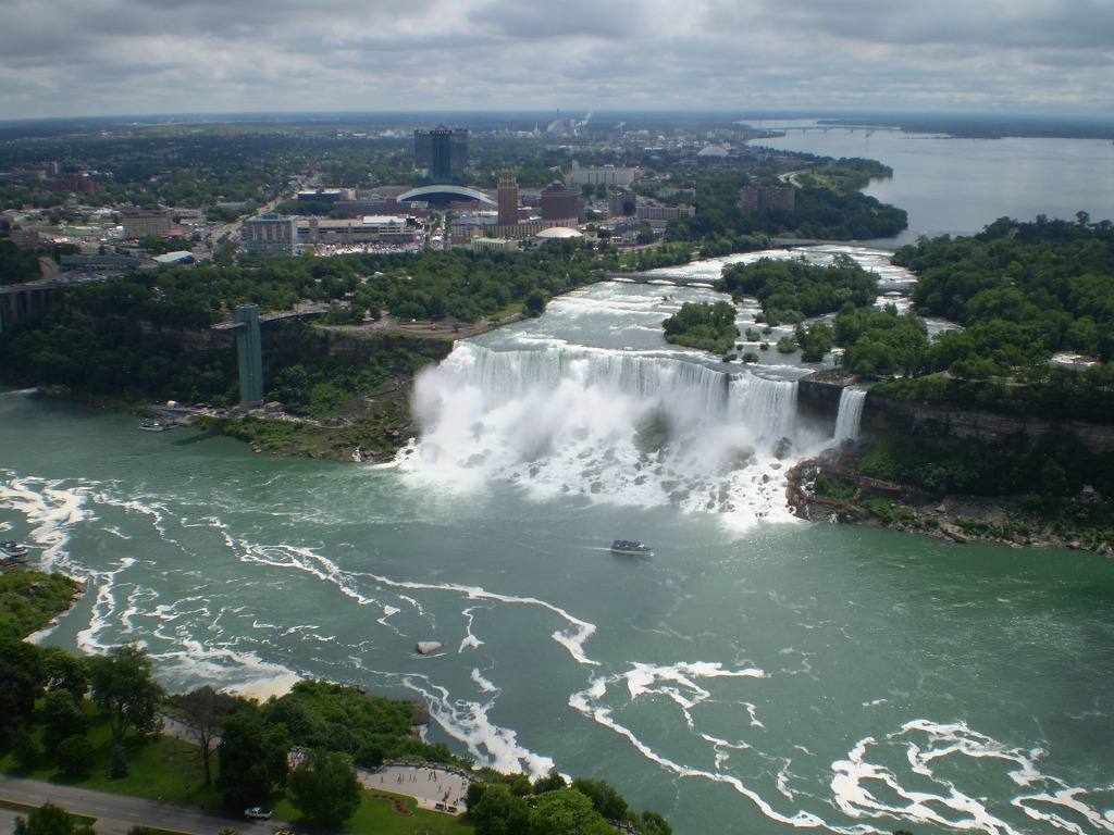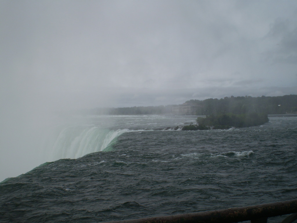 8. NIAGARA FALLS : 카나다와 미국사이에는 오대호가 있고 이들 호수는 서로 연결되 어 있다 .SUPERIOR, MICHIGAN, HURON 3개호수가 합쳐저서 ERIE호로 흘러들고, ERIE 호의 물은 다시 나이아가라 강을 따라 지반고 차이에 의하 여 폭포를 이룬후 ONTARIO 호로 흐르는데 ONTARIO호의 물은, 다시 Saint Lawrence 강으로 흘러 대서양으로 흘러 들어간다. 이들 5호수의 물의 양은 전 세계 민물의 1/5을 차지할 정도로 막대한 양이다. 나이아가라 강은 폭포에 접해 있는 고트섬에 의하여 두 줄기로 갈 라 지는데 고트섬과 미국육지와의 폭은 좁고 카 나다 쪽 강폭은 매우 넓다. 따라서 강물 의92%가 가나다 쪽 말발굽폭포(Horseshoe Falls)로 흐르므로 미국 측 폭포보다 훨씬 웅장 하다. 미국 측 강물은 루나 섬에 의하여 다시 두 줄기로 나누어지는데 넓은 것이 American Falls, 좁은 것이 Bridal Vell Falls 이다 . 따라서 미국령에2개 카나다령에 1개인 셈이다. 사진238,234 참조