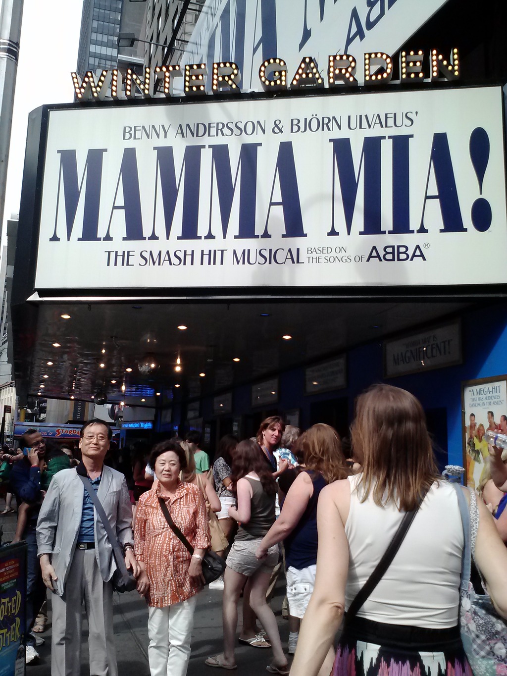 가슴 뿌듯하였다. 유람선타고 자유의 여신상 앞으로 한바퀴 돌고 시내 구석구석 좀 돌아 다녔었다. 모처럼 뉴욕에 왔으니 뮤지컬 “맘마미아”도 봤다. 주연 배우의 미모(금발미인이었음)와 가창력 연출력 정말 대 단 하였다. 전체관중이 기립박수 치며 환호 하는 그분위기에 나도 같이 하였다. 맘마미아는 한국에 서 영화로 이미 구경했기 때문에 내용을 어느 정도 알고 있어서 다행 이었다. 누구 던지 뉴욕가시면 뮤지컬관람 권하고 싶다.