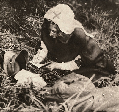 Western Front 근처에서 영국 군인의 유언을 적고 있는 적십자 간호사. 1917년.