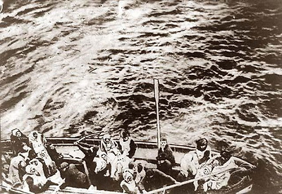 구조선 Carpathia로 옮겨 타기 직전의 타이타닉 호 생존자들. 1912년.