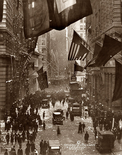 독일의 항복으로 1차 대전 종전을 축하하고 있는 월스트리트. 1918 년 11월.