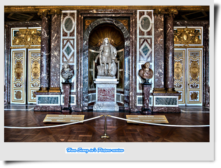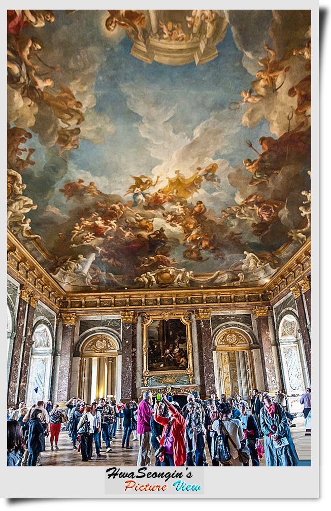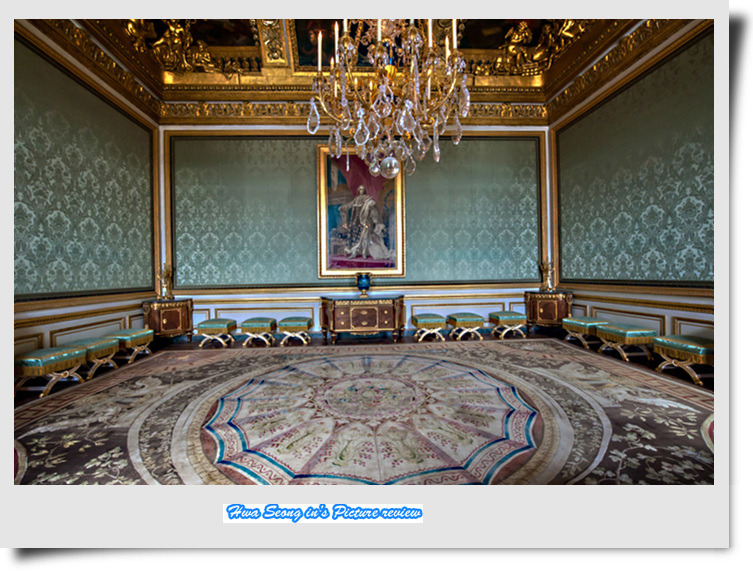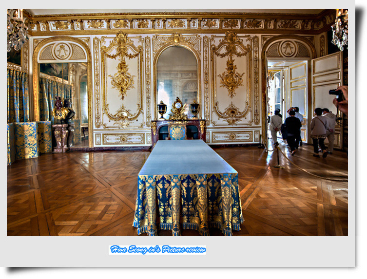 평화의 방 르브랜이 유럽이 평화를 되찾은 장면을 천정화로 그렸고 벽난로위 그림은 루이 15세가 유럽에 평화를 나누어 주고 있는 모습을 그린 르 므완느의 작품이다