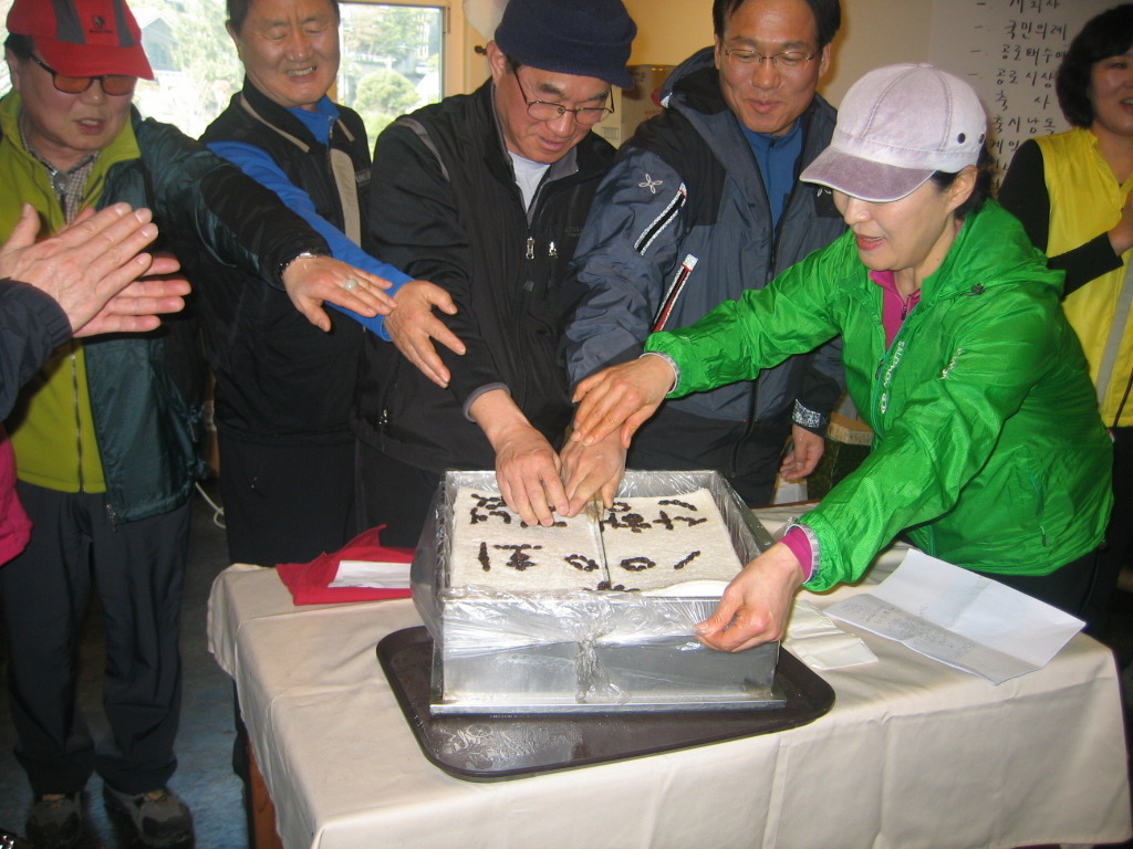 기념 케익을 짜르고 있는 장면