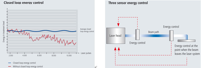 Closed Loop 에너지 조절 방식을 이용하여, 1차, 2차 에너지 모니터를 통해 수시로 수술 중 레이저를 체크하여