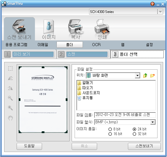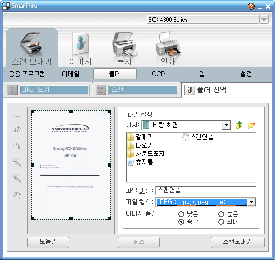 스캔보내기를 누르면 아래와 같이 스캔연습이라는 파일이 왼쪽에 보여 진다.