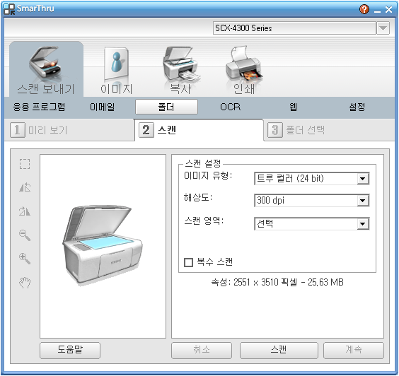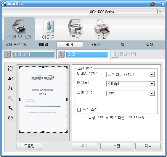 스캔된 문서를 저장하기 위하여 스캔버튼 옆의 계속 버튼을 누르면 아래의 화면이 나온다.