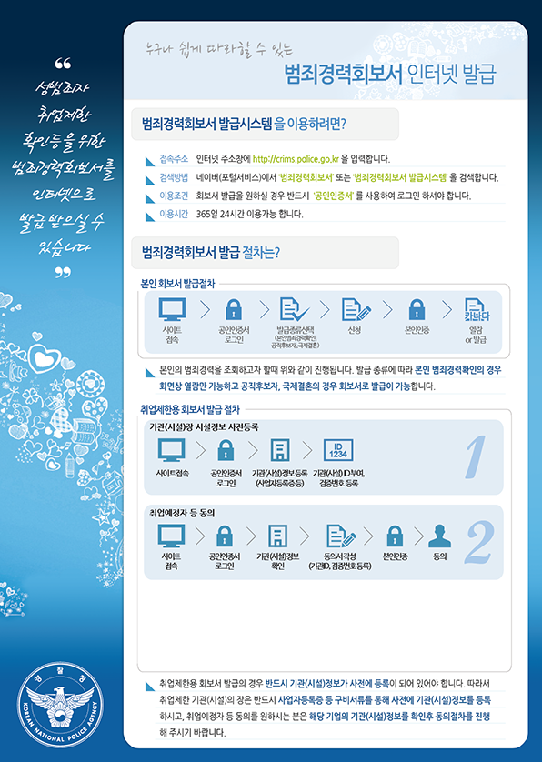 성범죄자 취업제한 확인 등을 위한 범죄경력회보서를 인터넷으로 발급받으실 수 있습니다.