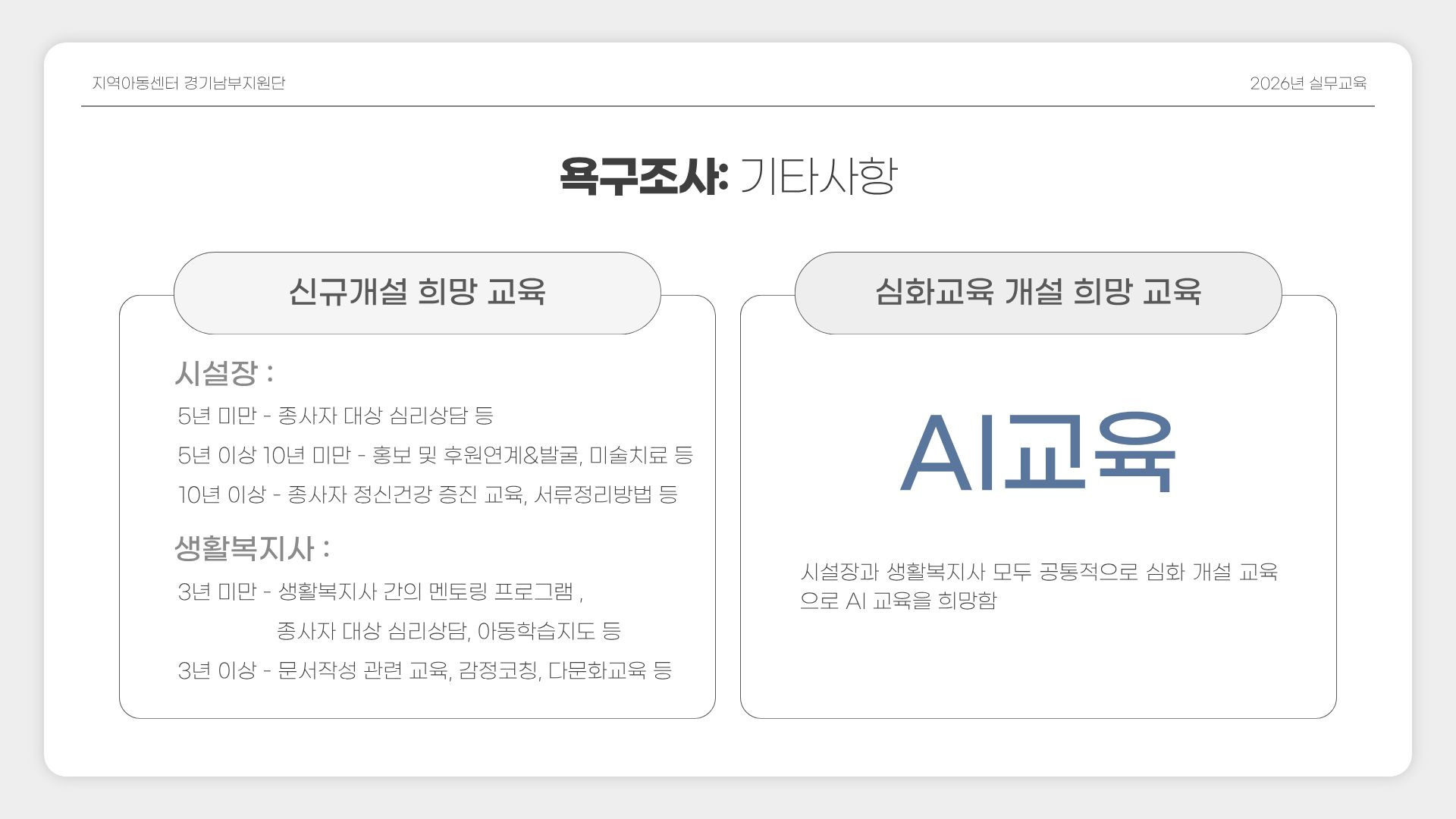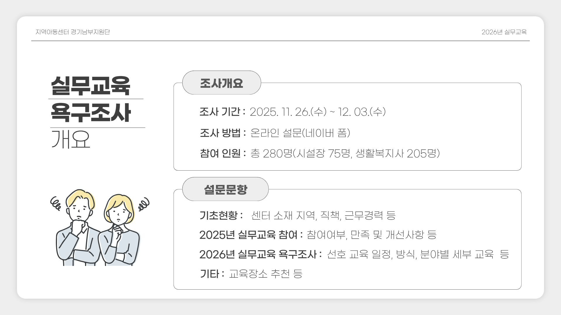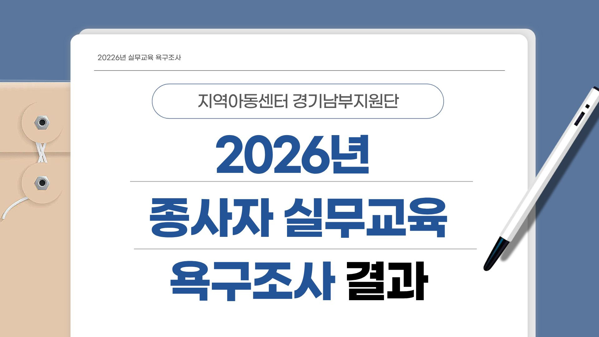 2026년 종사자 실무교육 욕구조사 결과 작성자경기남부지원단|작성시간25.12.23|조회수147 목록 댓글 0 글자크기 작게가 글자크기 크게가 다음검색 현재 게시글 추가 기능 열기 북마크 공유하기 신고 센터로 신고 댓글 댓글 0 댓글쓰기 답글쓰기 댓글 리스트