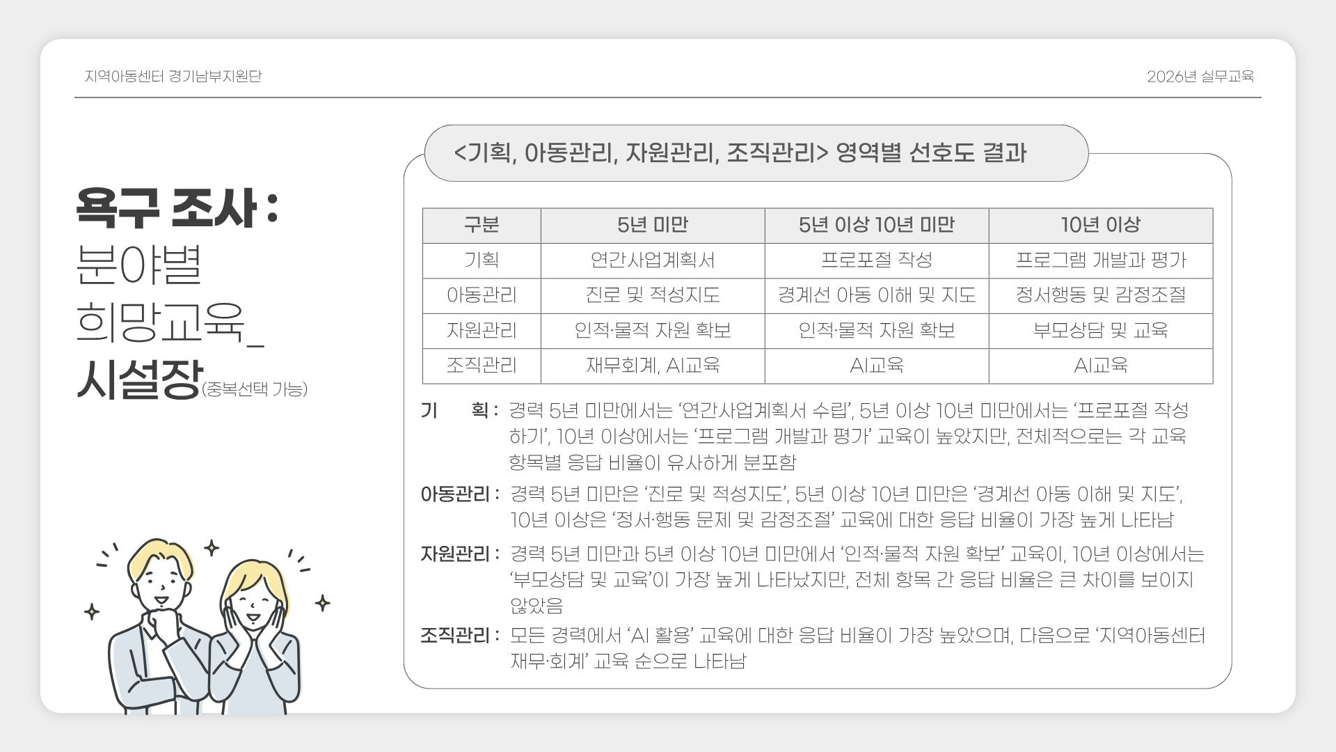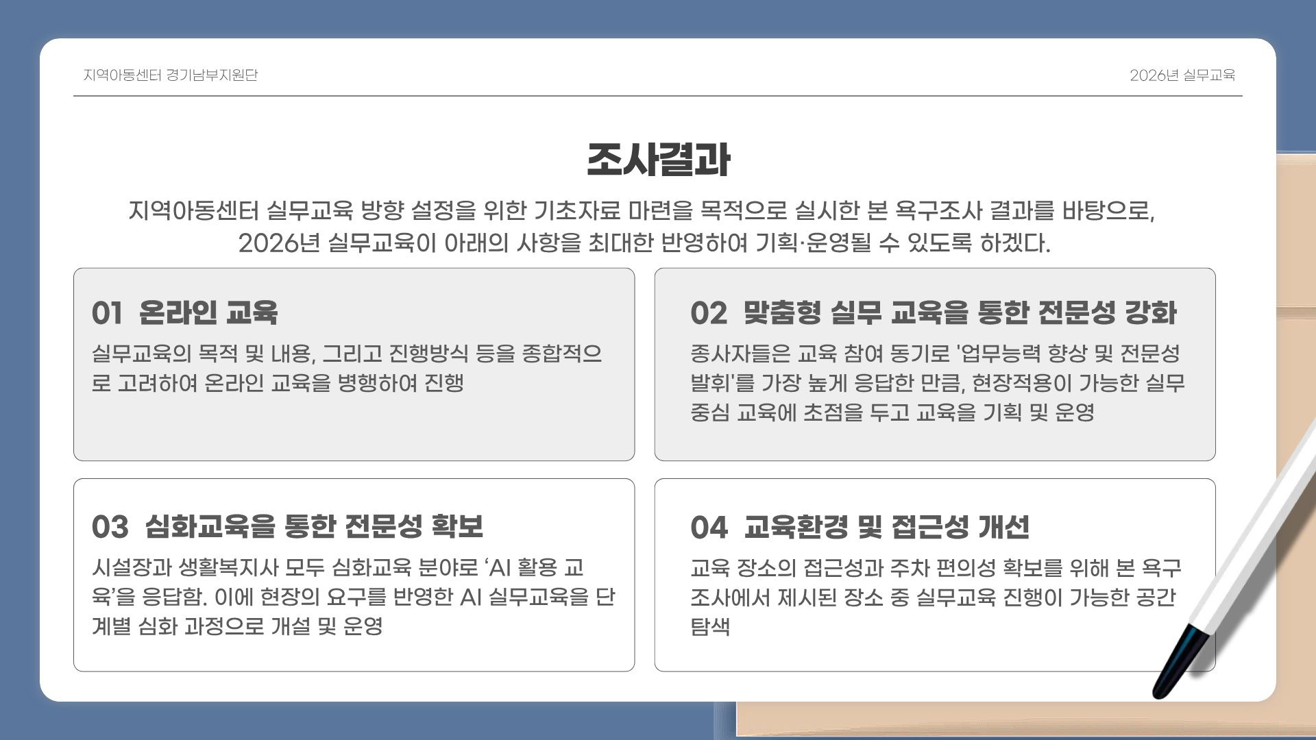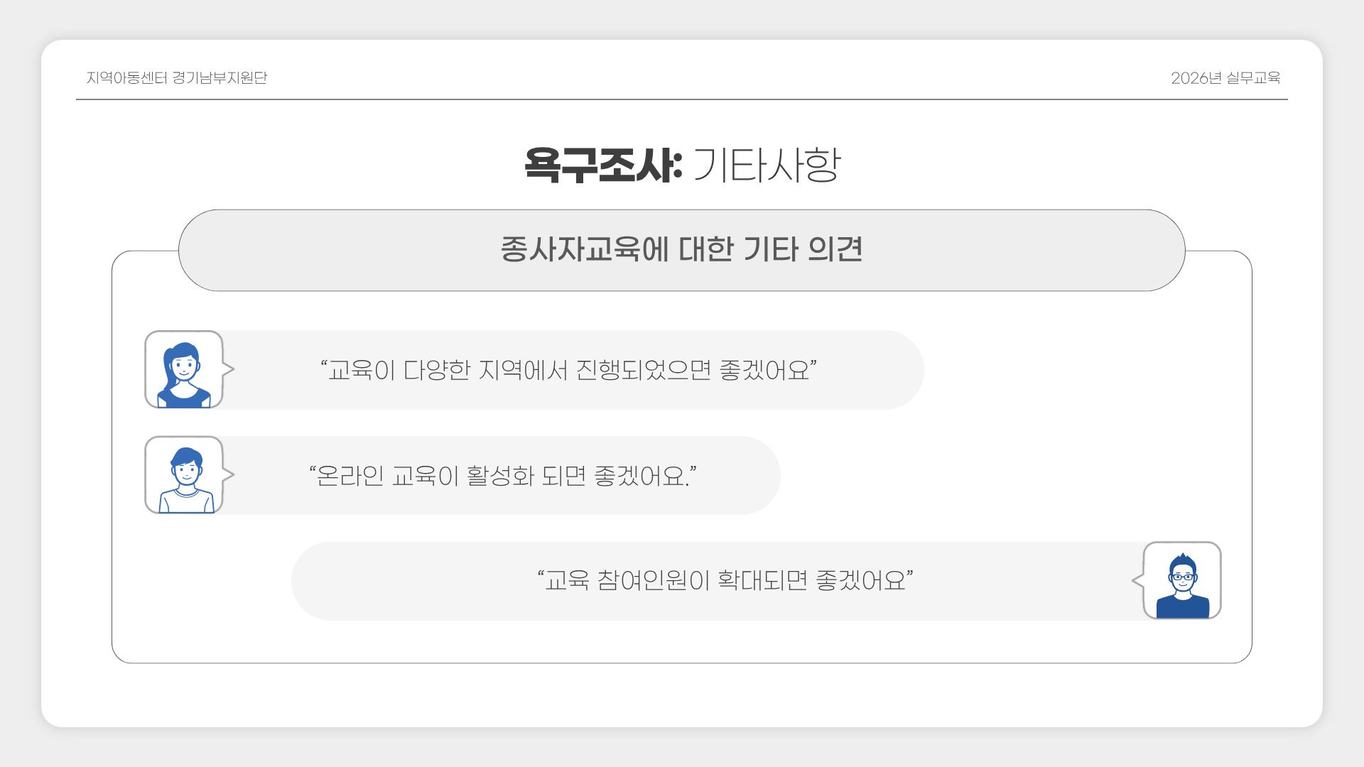 2026년 종사자 실무교육 욕구조사 결과 작성자경기남부지원단|작성시간25.12.23|조회수147 목록 댓글 0 글자크기 작게가 글자크기 크게가 다음검색 현재 게시글 추가 기능 열기 북마크 공유하기 신고 센터로 신고 댓글 댓글 0 댓글쓰기 답글쓰기 댓글 리스트