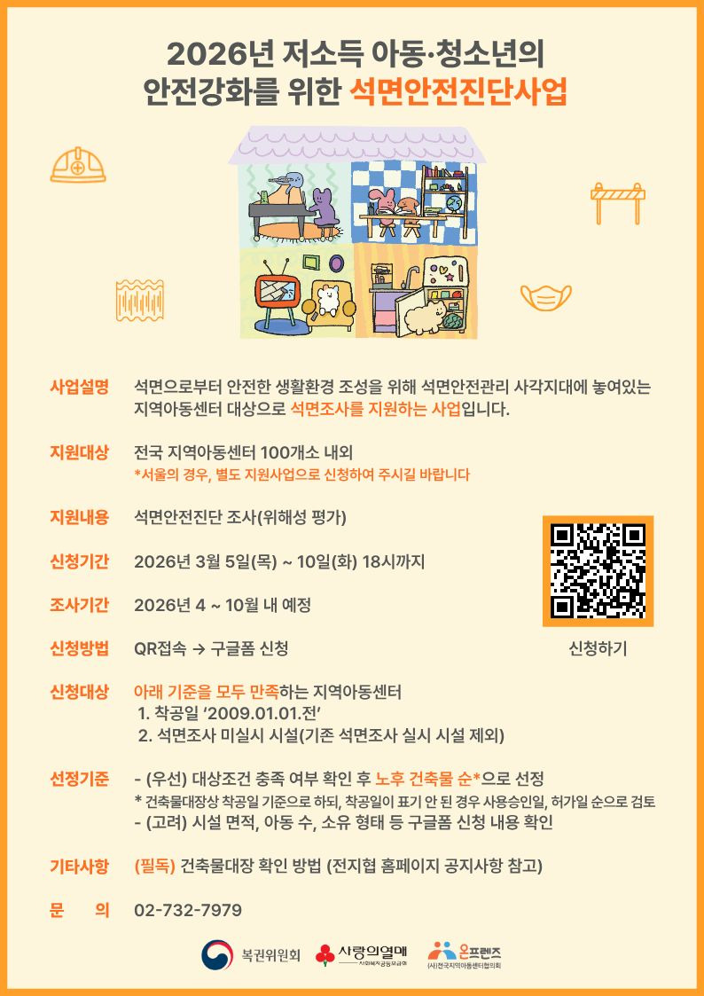 [전지협온프렌즈] 2026년 저소득 아동·청소년의 안전강화를 위한 석면안전진단사업 신청 안내 및 홍보 작성자경기남부지원단|작성시간26.03.05|조회수63 목록 댓글 0 글자크기 작게가 글자크기 크게가 다음검색 현재 게시글 추가 기능 열기 북마크 공유하기 신고 센터로 신고 댓글 댓글 0 댓글쓰기 답글쓰기 댓글 리스트