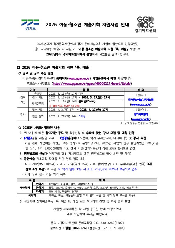 [경기아트센터] 2026년 아동 청소년 예술기회 지원사업 작성자경기남부지원단|작성시간26.03.06|조회수118 목록 댓글 0 글자크기 작게가 글자크기 크게가 다음검색 현재 게시글 추가 기능 열기 북마크 공유하기 신고 센터로 신고 댓글 댓글 0 댓글쓰기 답글쓰기 댓글 리스트