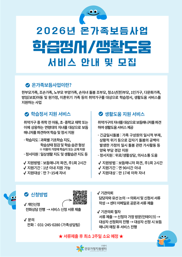 2026년 온가족보듬사업 학습정서 및 생활도움지원' 이용가정 모집 작성자경기남부지원단|작성시간26.03.23|조회수80 목록 댓글 0 글자크기 작게가 글자크기 크게가 다음검색 현재 게시글 추가 기능 열기 북마크 공유하기 신고 센터로 신고 댓글 댓글 0 댓글쓰기 답글쓰기 댓글 리스트