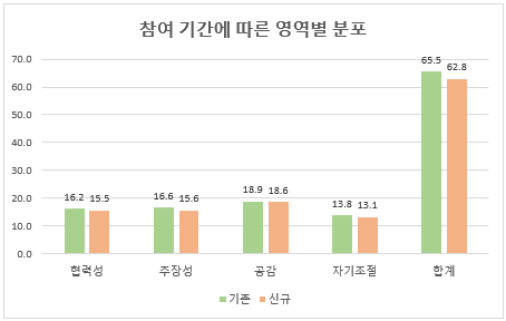 초등 고학년에 비해 저학년이 모든 항목에서 전반적으로 낮게 산출되었는데, 그 중 저학년과 고학년 모두 공감능력 각 16.8점, 18.3점으로 가장 높았고 자기조절이 각 11.6점, 13.7점으로 가장 낮았습니다. 또한 기존 아동과 신규아동 모두 공감능력 각 18.9점, 18.6점으로 가장 높았고, 자기조절 능력도 각 13.8점, 13.1점으로 가장 낮았습니다.