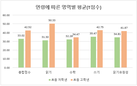 저학년 아동은 읽기 유창성이 34.81점으로 가장 높았으나, 모든 영역이 30점 대로 또래보다 낮았습니다. 반면 고학년 아동은 읽기 영역이 50.33점으로 가장 높았고 그 외 영역도 또래 수준을 유지하였으나, 수학 영역은 34.47점으로 낮아 또래보다 낮았습니다.