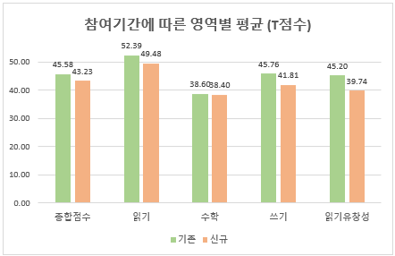 기존 아동은 읽기 영역이 52.39점으로 가장 높아 보통 수준이었고, 수학 영역이 38.6점으로 가장 낮았습니다. 또한 신규 아동도 읽기 영역이 49.48점으로 가장 높아 보통 수준, 수학 영역이 38.40점으로 낮았습니다. 대체로 수학 영역과 신규아동 읽기 유창성 영역은 40미만으로 또래보다 낮았고, 다른 영역은 또래 수준을 유지하였습니다.