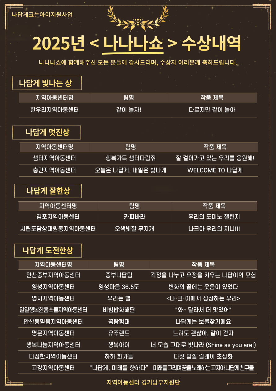 수상작 선정 이후에는 각 참여기관에서 2025년 나답게 크는 아이 지원사업 수료식과 ‘나나나쇼’ 시상식을 함께 진행했습니다 🎉