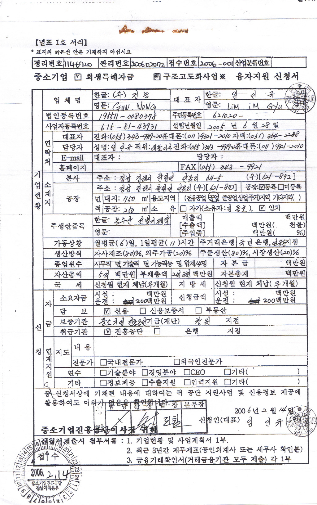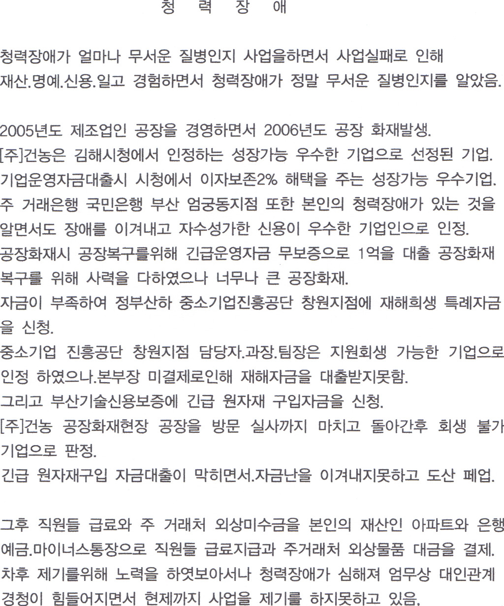 공장복구을 하기위해 중소기업 진흥공단 창원지점 담당자로부터 회생가능기업으로 통보을받고