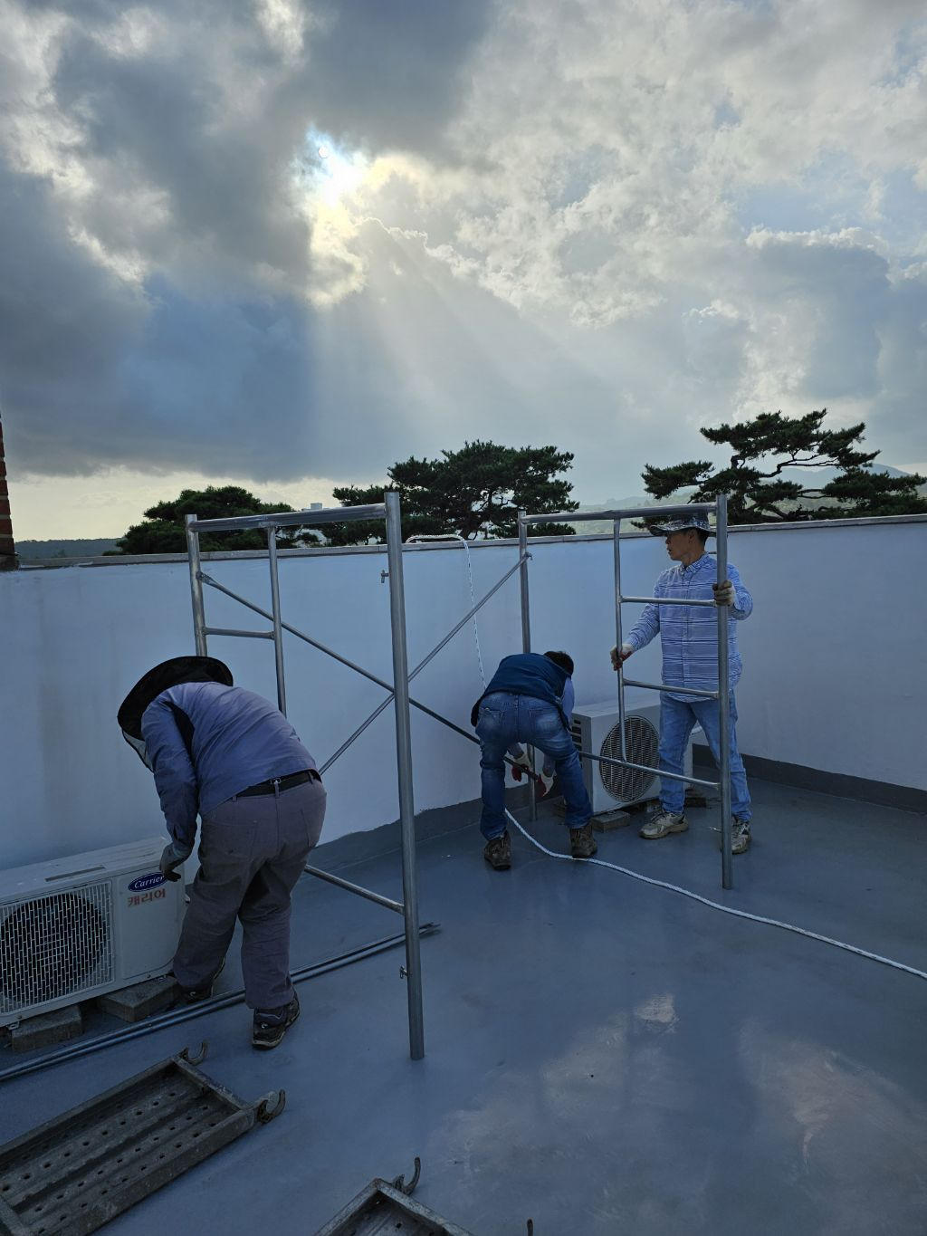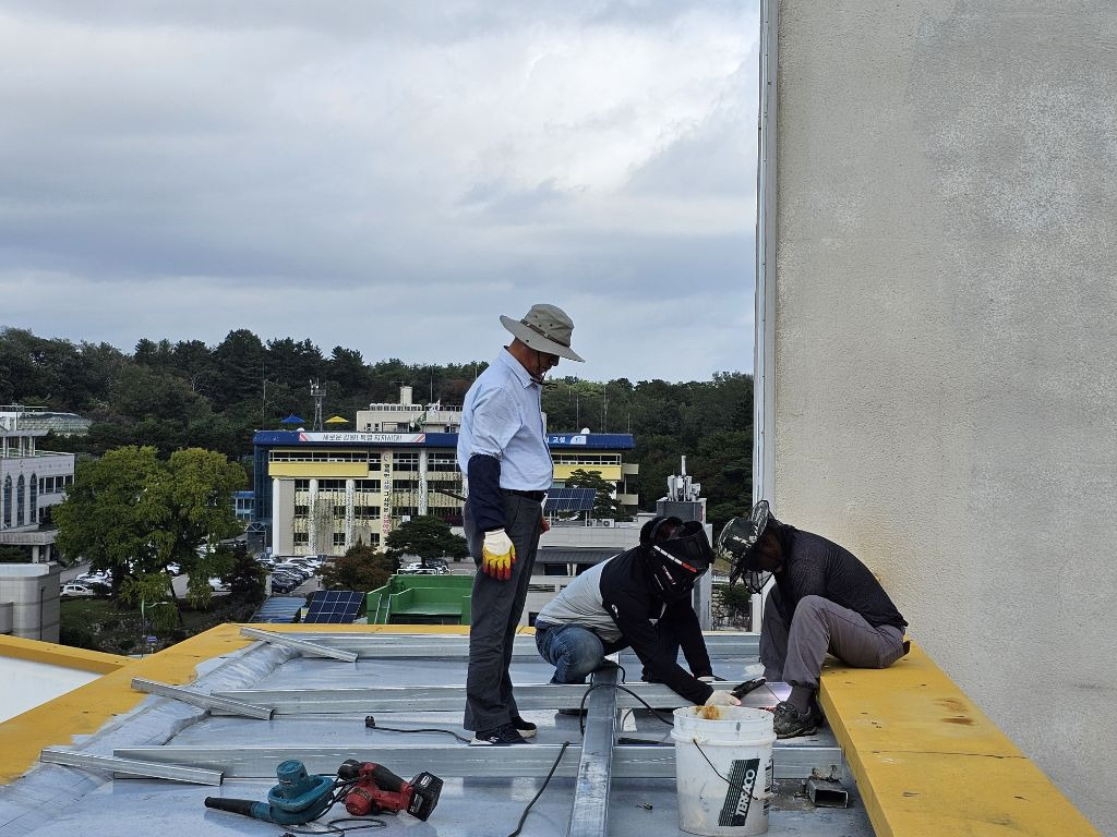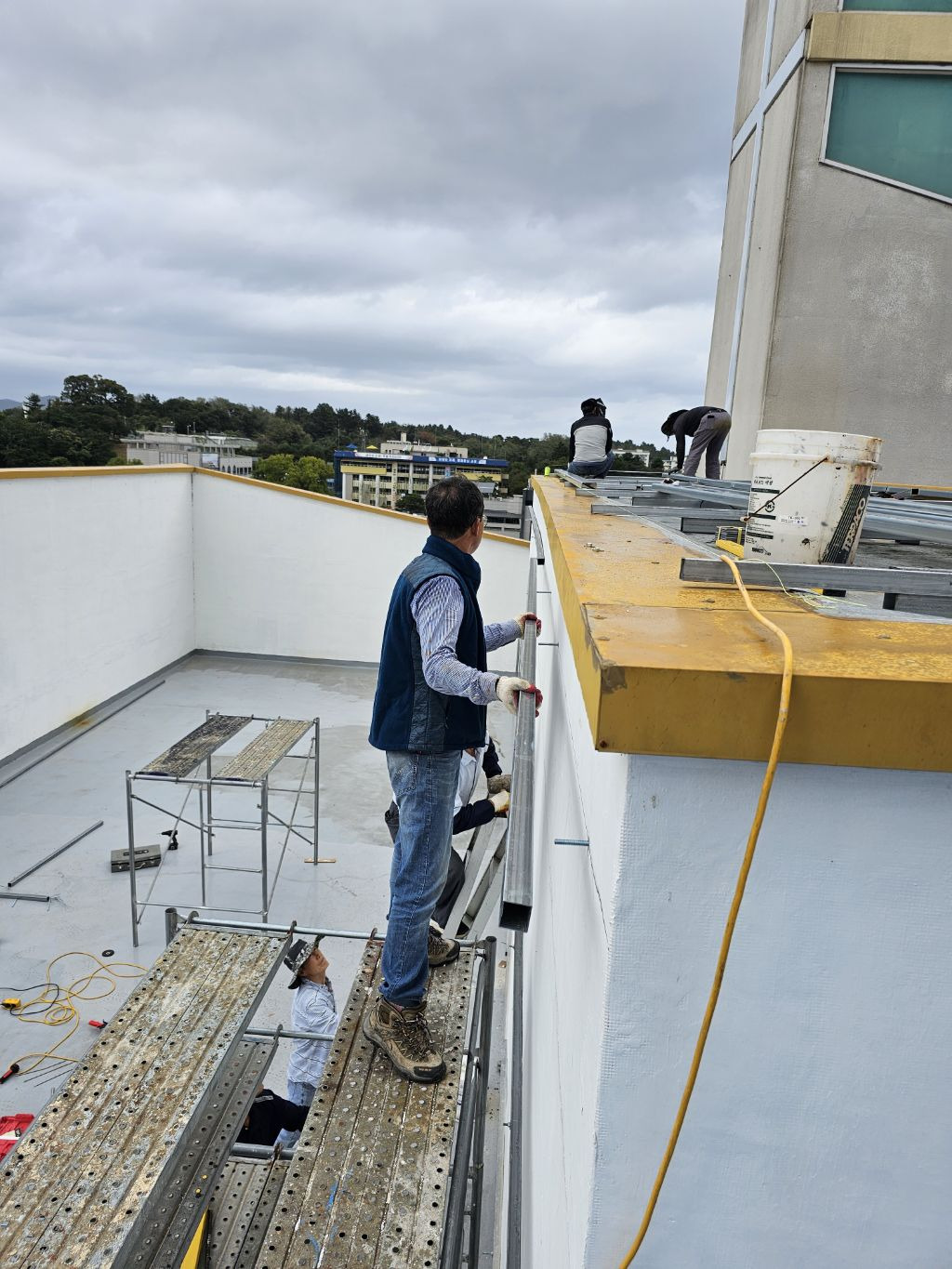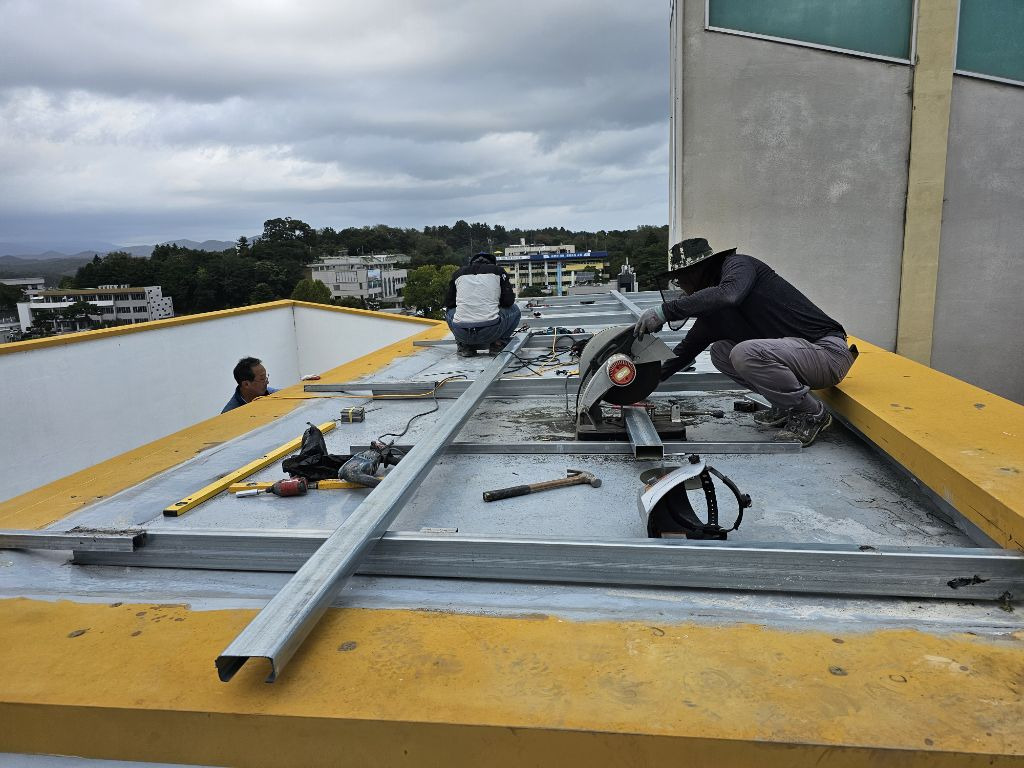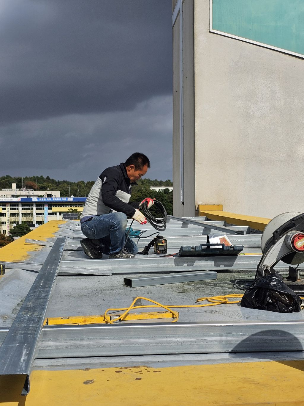 비전관에 누수가 있어서 그동안 공사를 많이 했습니다. 하나님께서 건축에 관련된 분들을 많이 보내주셔서 비전관의 옥탑을 완전히 덥는 공사를 합니다. 누수의 원인이 되었기 때문입니다. 또 본당의 미비한 부분도 이번 기회에 모두 작업하여 마무리 하려 합니다. 이를 위해 오늘 남선교회 회원들이 판넬을 붙일 수 있도록 뼈대 작업을 했습니다. 징크판넬로 완전히 싸고 지붕까지 덮어서 누수를 완전히 잡을 예정입니다. 김중섭 권사님과 저만 빼고 모두 건축 일을 하시던 분들이라 일찍 공사가 마무리가 되었습니다. 모두 수고하셨습니다.