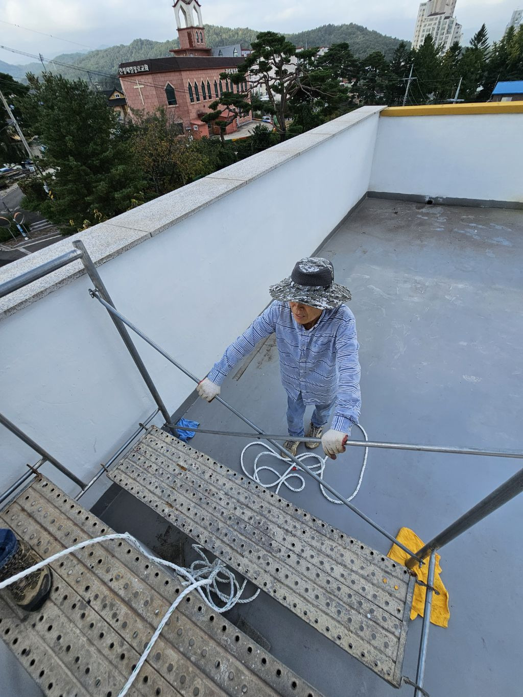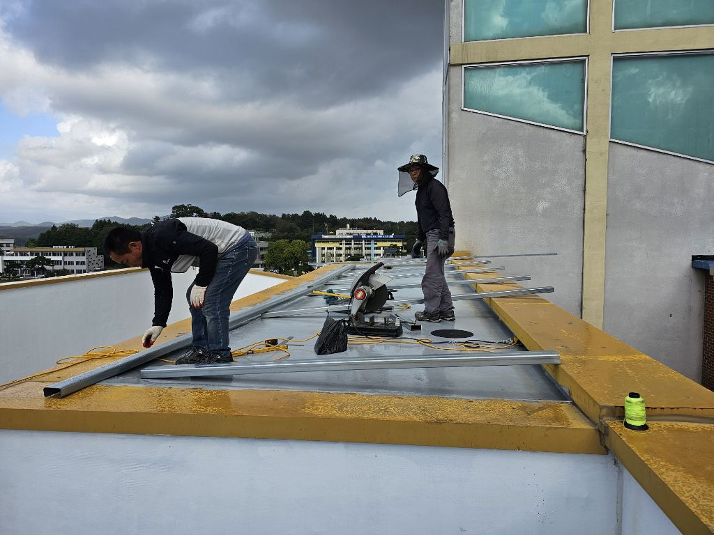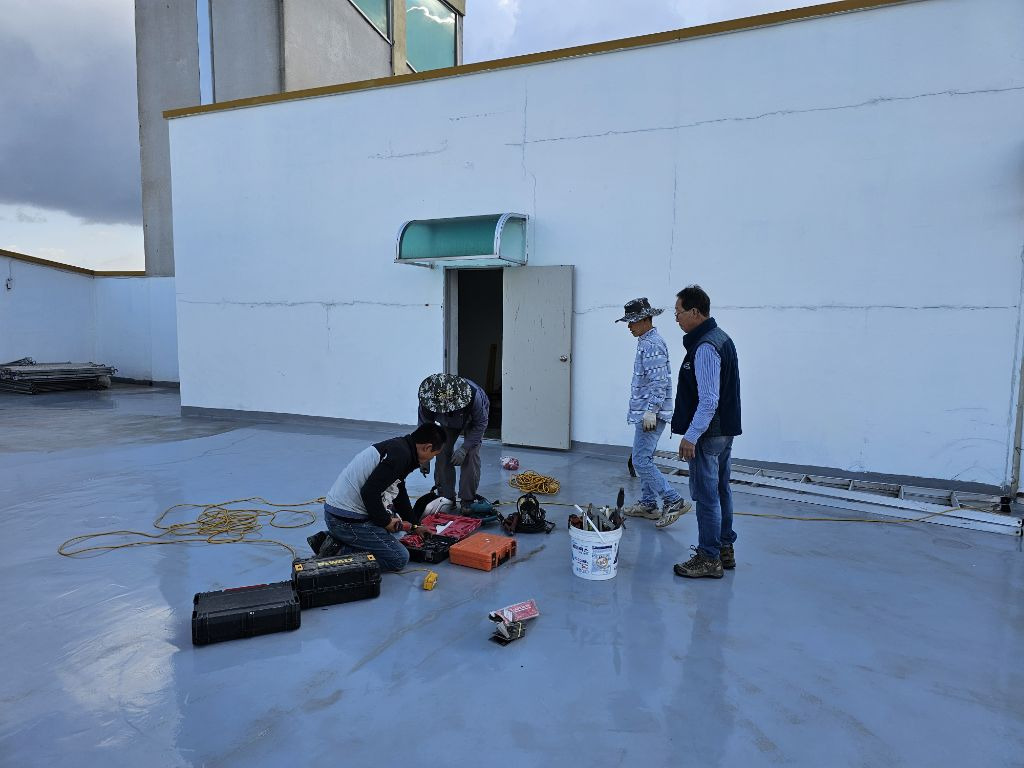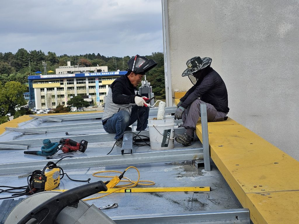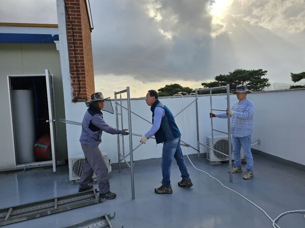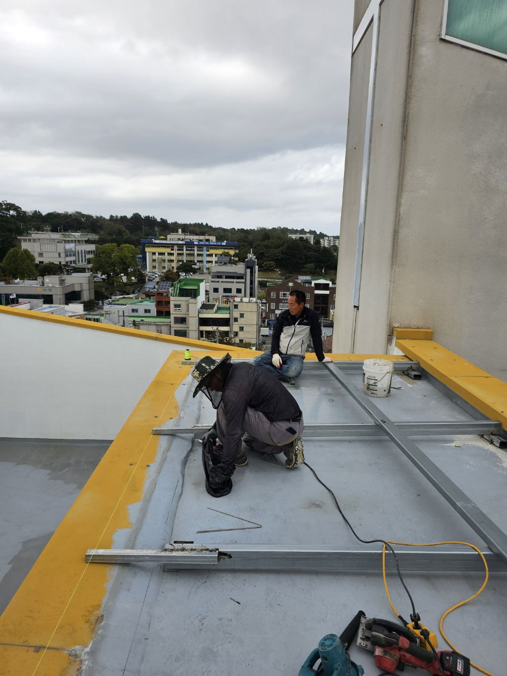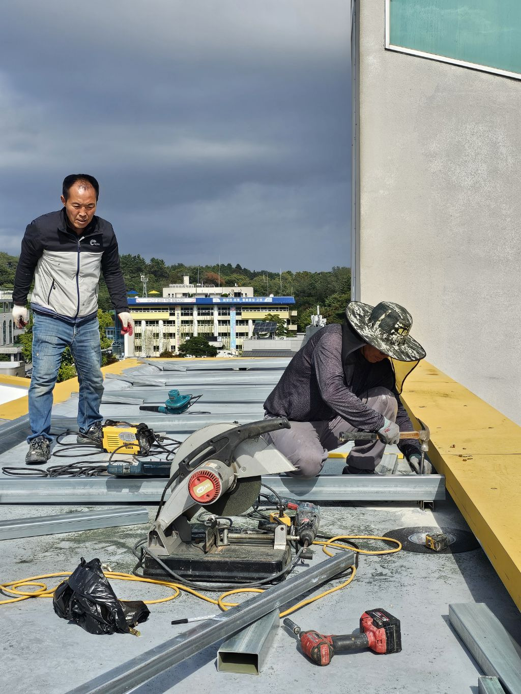 비전관에 누수가 있어서 그동안 공사를 많이 했습니다. 하나님께서 건축에 관련된 분들을 많이 보내주셔서 비전관의 옥탑을 완전히 덥는 공사를 합니다. 누수의 원인이 되었기 때문입니다. 또 본당의 미비한 부분도 이번 기회에 모두 작업하여 마무리 하려 합니다. 이를 위해 오늘 남선교회 회원들이 판넬을 붙일 수 있도록 뼈대 작업을 했습니다. 징크판넬로 완전히 싸고 지붕까지 덮어서 누수를 완전히 잡을 예정입니다. 김중섭 권사님과 저만 빼고 모두 건축 일을 하시던 분들이라 일찍 공사가 마무리가 되었습니다. 모두 수고하셨습니다.