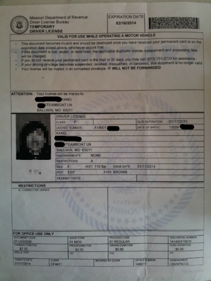 J1인 남편이 먼저 배달됐고 저는 사실 거의 한 달 되기 전에 왔어요. 조마 조마해서 발급한 Driver License Bureau(573-751-1887 or DLB.CI@dor.mo.gov)에 전화 했더니 자기네는 왜 느린지 잘 모른다고 하고 J2랑은 무관하다고 하네요. 하지만, 남편은 제가 J2라 느리다고 하고 어쨌든 임시운전면허증 expirataion Date 2월 16일 전에 받았습니다. 이제 여권을 들고 다니지 않아도 됩니다. 미국서 비행기를 타든 어디를 가든 운전면허증은 가장 중요한 ID카드기 때문에 빨리 받을수록 좋겠죠?