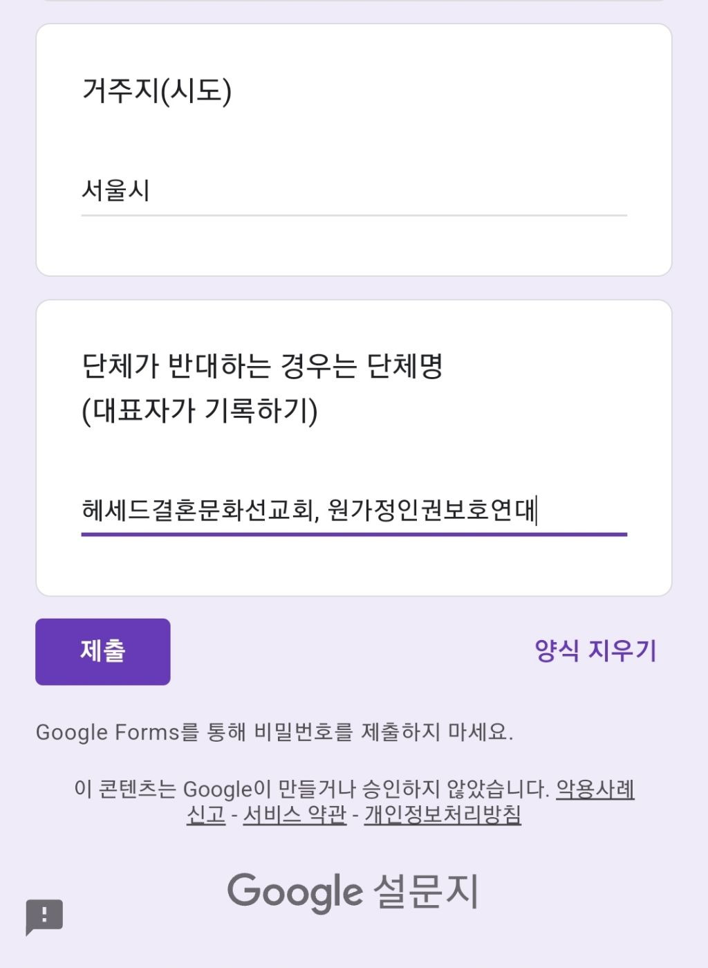 ๐ฎํค์ธ๋๊ฒฐํผ๋ฌธํ์ ๊ตํ์ ์๊ฐ์ ์ธ๊ถ๋ณดํธ์ฐ๋๋ ์ ํ์ฐ(์ ๊ตญํ๋ถ๋ชจ๋จ์ฒด์ฐํฉ) ์ฑ๋ช ์๋ฅผ ์ง์งํ๋ฉฐ, ๏ผ'์ฑ์์ฃผ์์' ๋์์ ์ด์ค๊ณ ๋์๊ด๊ณผ ๊ณต๊ณต