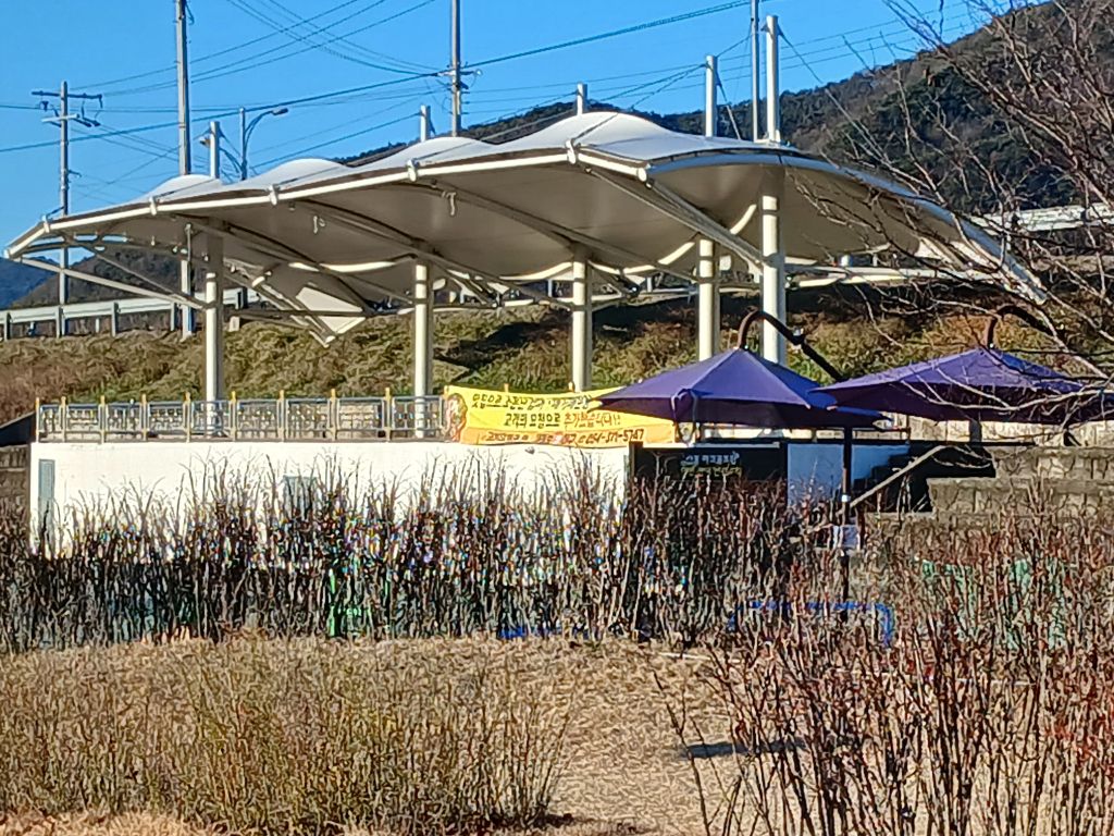 산동(금천)파크골프장은 상류부 동쪽에 C, D 코스와 하류부 서쪽에 A, B 코스로 구성되어 있으며, 80여대를 수용할 수 있는 넓은 주차장과 다목적 광장이 있습니다. 또한 구장 강너머 남쪽에는 금천 체육공원으로 캠핑장의 텐트가 갈대와 함께 초겨울의 운치를 더해주는 아름다운 구장이었습니다.