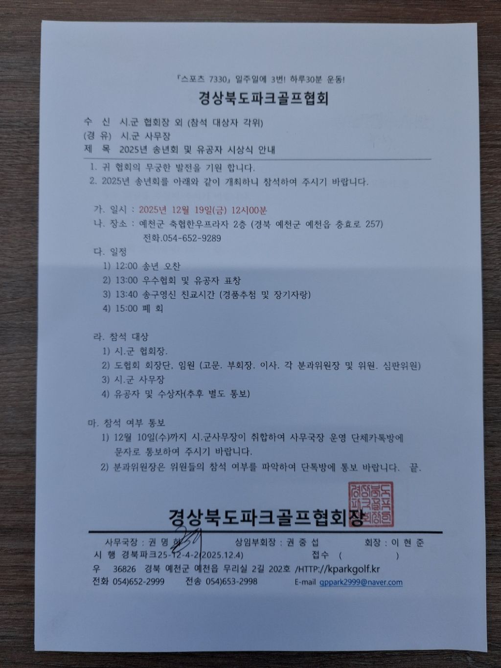 2025년 경북파크골프협회 송년회 및 유공자 시상식 안내 작성자천종우|작성시간25.12.18|조회수38 목록 댓글 0 글자크기 작게가 글자크기 크게가 2025년 경북파크골프협회 송년회 및 유공자 시상식 안내 다음검색 현재 게시글 추가 기능 열기 북마크 공유하기 신고 센터로 신고 댓글 댓글 0 댓글쓰기 답글쓰기 댓글 리스트