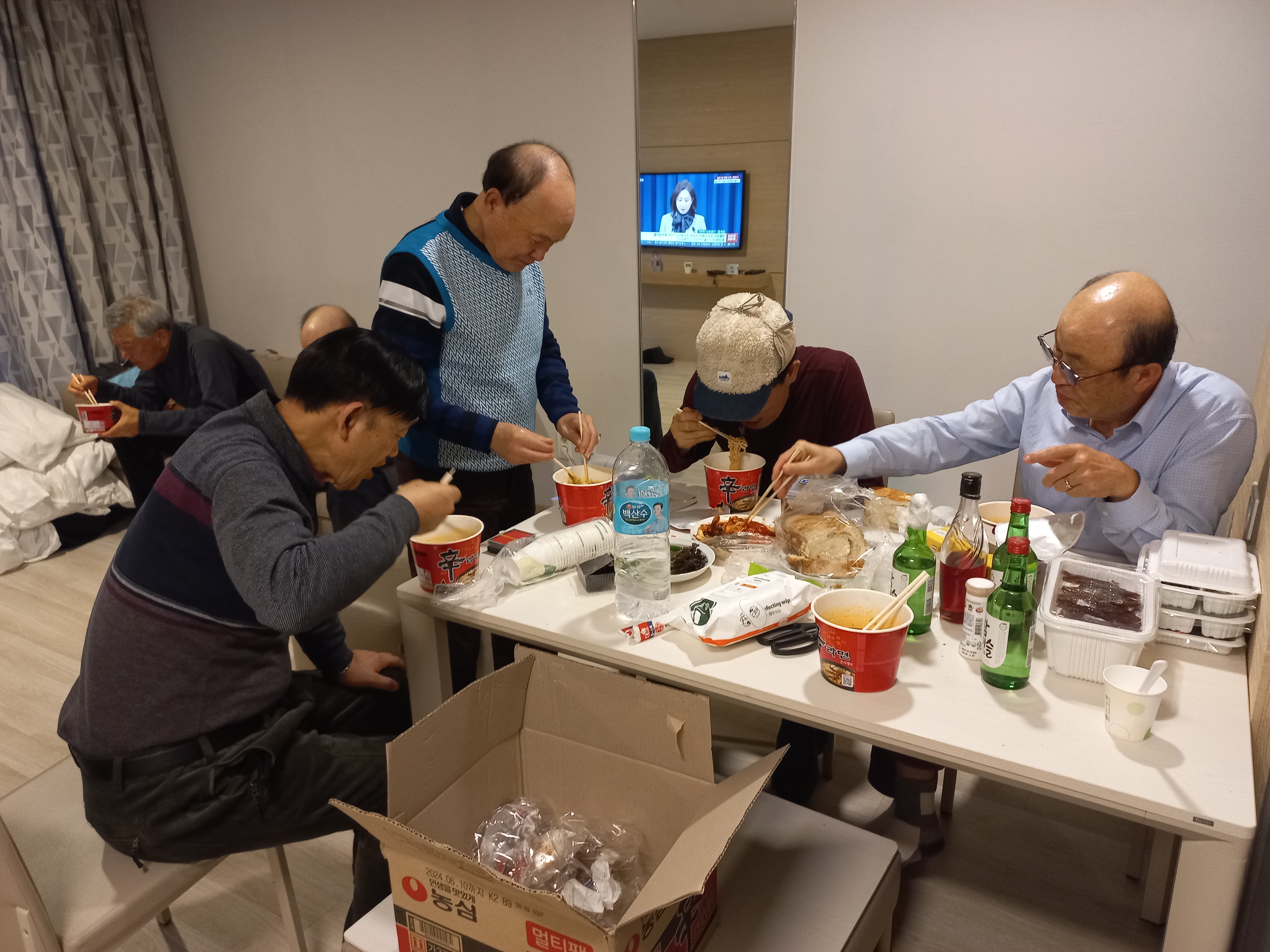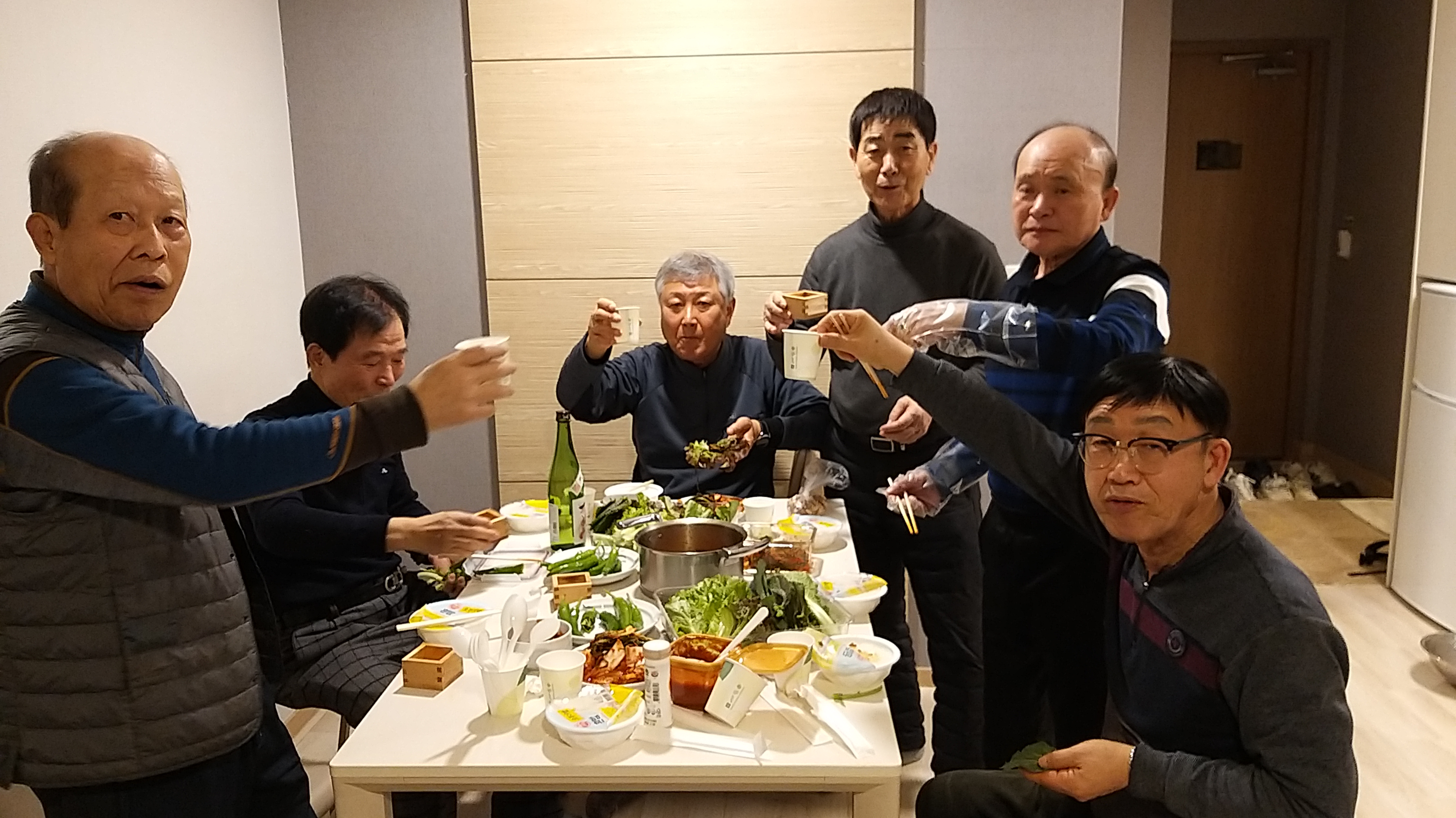 7사람 모두가 역할을 분담해 취사 조리하고 불고기랑 과메기에 술도 겯드려 먹으면서