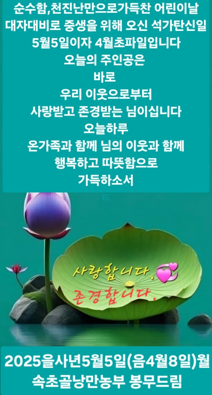2025년 5월 5일은 어린이 날과 석가탄신일(4월 초파일) 작성자천종우|작성시간25.05.05|조회수114 목록 댓글 1 글자크기 작게가 글자크기 크게가 2025년 5월 5일은 어린이 날과 석가탄신일(4월 초파일) 다음검색 현재 게시글 추가 기능 열기 북마크 공유하기 신고 센터로 신고 댓글 댓글 1 댓글쓰기 답글쓰기 댓글 리스트 작성자천종우 작성자 본인 여부 작성자 | 작성시간 25.05.05 봉무님!오랫만입니다.속초골 낭만 농부하느라 수고가 많지요.자연인 한 번 해 보시지요.얼굴 본지도 오래되어 아른거립니다.늘 건강하세요. 댓글 전체보기