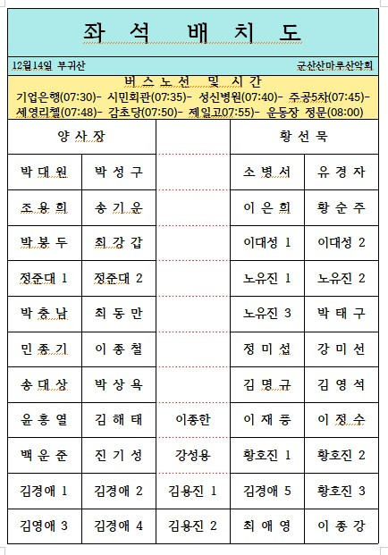 부귀산[25-12-14] 좌석배치도 작성자마이혼[이민상]|작성시간25.12.12|조회수70 목록 댓글 0 글자크기 작게가 글자크기 크게가 다음검색 현재 게시글 추가 기능 열기 북마크 공유하기 신고 센터로 신고 댓글 댓글 0 댓글쓰기 답글쓰기 댓글 리스트