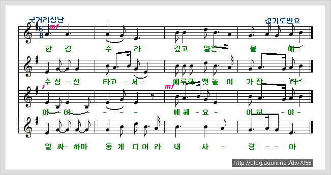 [스크랩] 한강수 타령[악보*음악*가사] - 고등학교음악 작성자주오시리|작성시간13.08.23|조회수1,204 목록 댓글 0 글자크기 작게가 글자크기 크게가 한강수 타령 한강수 타령[악보*음악*가사] - 고등학교음악 한강수라 깊고 맑은 물에 수상선 타고서에루화 뱃놀이 가잔다아하 에헤요 에헤요 어허야 얼사함마둥게 디여라 내 사랑아 다음검색 스크랩 원문 : 춘천 대우인력 김진규 현재 게시글 추가 기능 열기 북마크 공유하기 신고 센터로 신고 댓글 댓글 0 댓글쓰기 답글쓰기 댓글 리스트