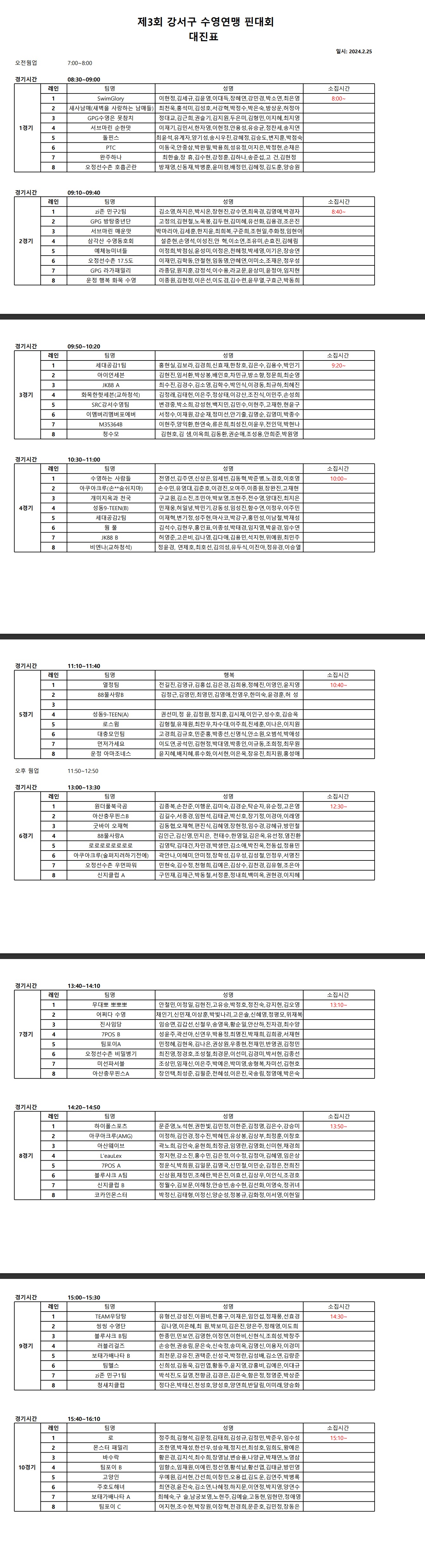 2.소집시간 엄수, 1경기 소집시간 8:00~ /6경기 소집시간 12:30~