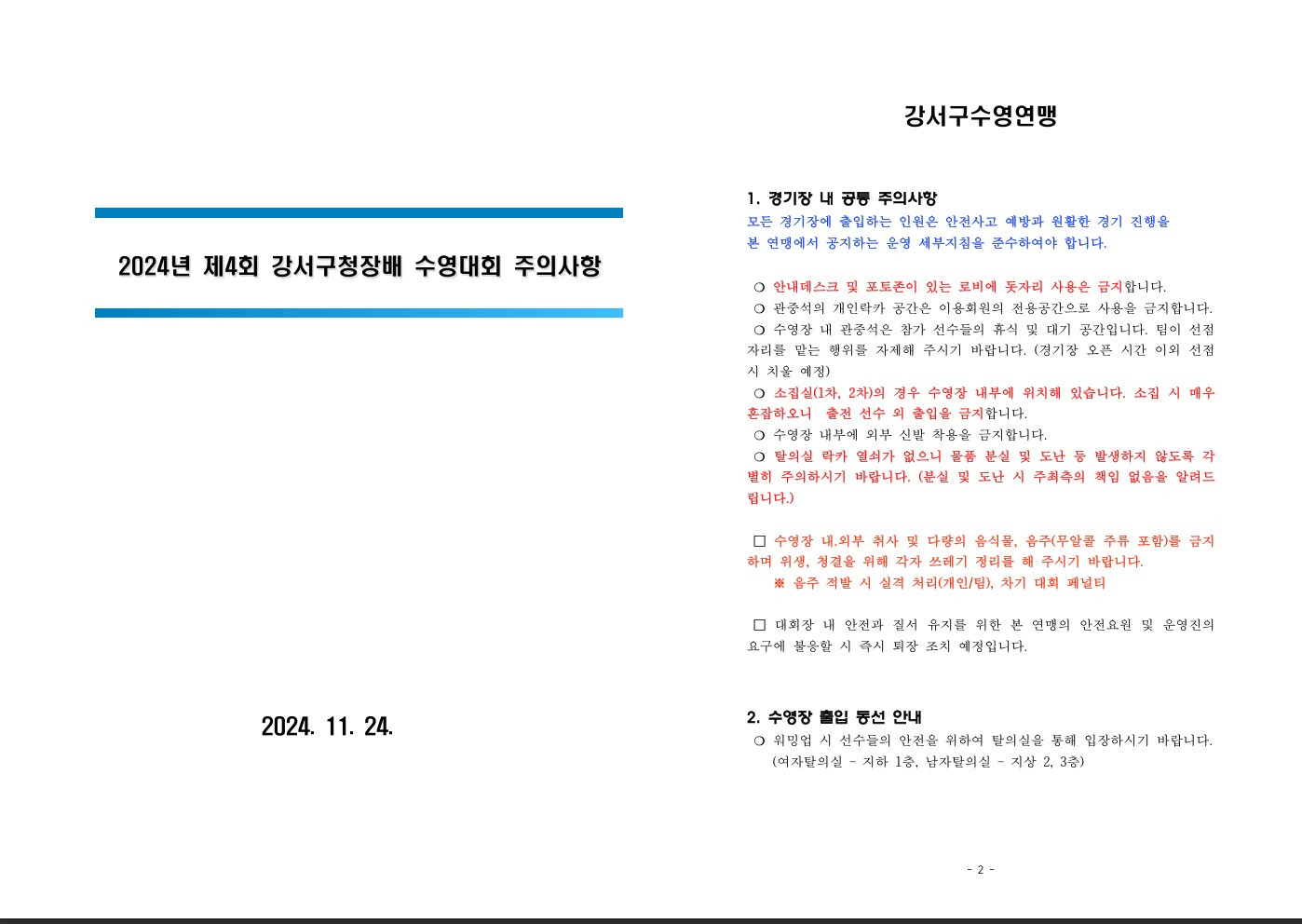 제4회 강서구청장배 수영대회 주의사항 작성자강수연 (사무)|작성시간24.11.18|조회수730 목록 댓글 0 글자크기 작게가 글자크기 크게가 제4회 강서구청장배 수영대회 세부주의사항-1.pdf93.54KB 첨부파일첨부된 파일이 3개 있습니다. jpeg 파일 스크린샷_19-11-2024_02445_.jpeg 다운로드 jpeg 파일 스크린샷_19-11-2024_0251_.jpeg 다운로드 pdf 파일 제4회 강서구청장배 수영대회 세부주의사항-1.pdf 다운로드 다음검색 현재 게시글 추가 기능 열기 북마크 신고 센터로 신고 댓글 댓글 0 댓글쓰기 답글쓰기 댓글 리스트