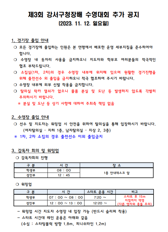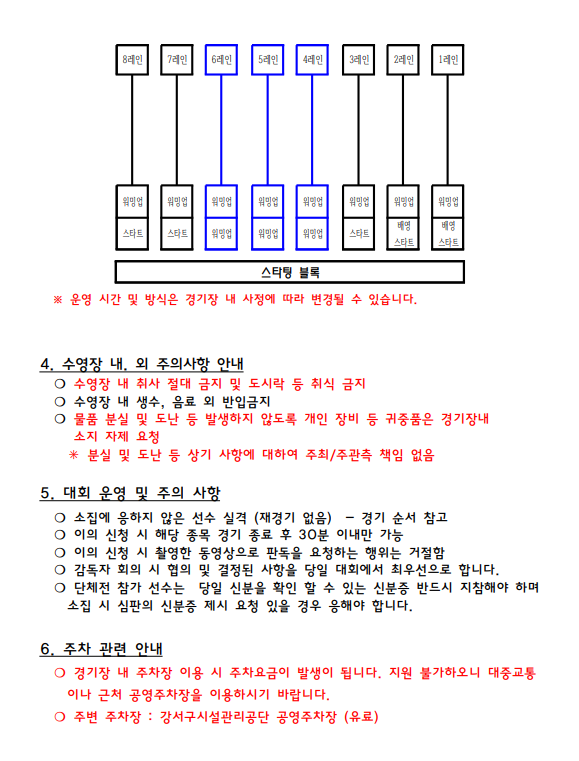 제3회 강서구청장배 수영대회 운영 세부지침을 공지합니다.