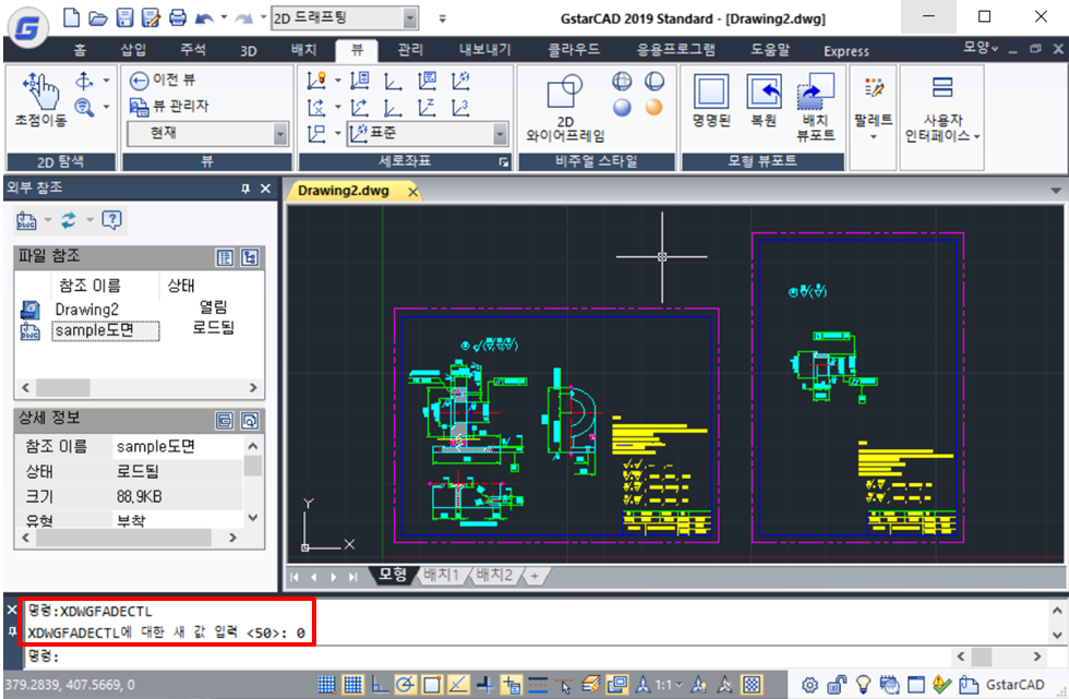 3. 아래 그림과 같이 명령행을 확인하여 설정값을 0으로 입력 시 외부참조 도면이 선명해진 것을 확인할 수 있습니다.