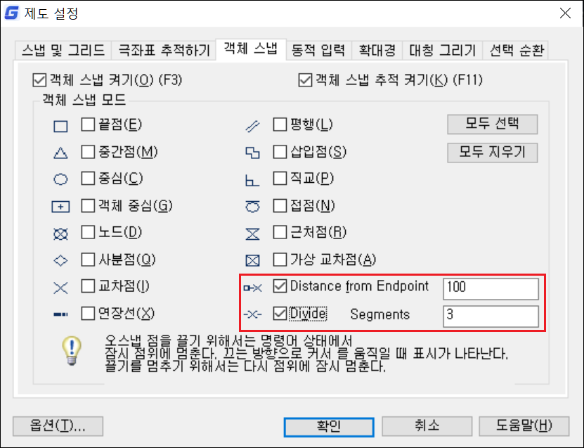 2. [Distance from Endpoint]와 [Divide Segments]가 체크되어있는지 확인합니다.