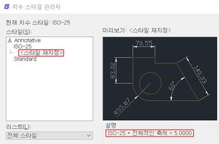 <스타일 재지정>이라는 하위 항목이 생성되며, 치수 객에 변경한 변수 값이 고정됩니다. ☞ 2번 방법