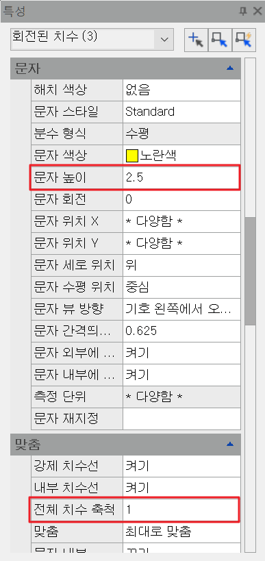 ③ 치수가 선택된 상태에서 특성 창(Ctrl+1)을 띄우고, 선택된 치수 문자 크기를 일괄 변경합니다.