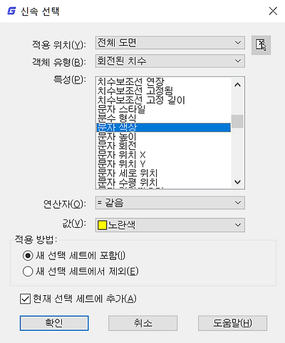 ② 회전된 치수 - 치수스타일을 선택합니다. 만약 <스타일 재지정>으로 여러 번의 치수를 변경했을 때는 구별되는 항목을 선택합니다. 예시는 문자색상으로 구별되는 경우입니다.