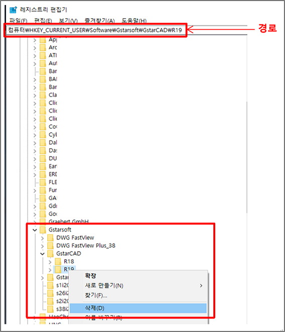 ※레지스트리 제거시 반드시 GstarCAD(혹은 Gstarsoft)관련 내용만 삭제하셔야 합니다.