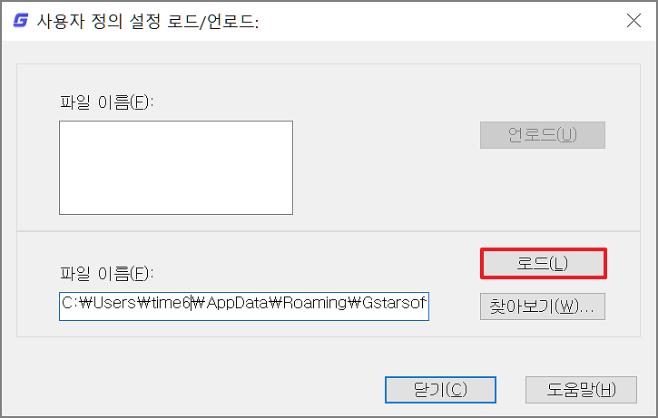 4) 파일 이름에 gcad.cuix경로가 표시되면 우측의 로드 버튼을 눌러 메뉴를 로드합니다.