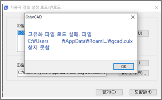 ※ 아래 그림과 같이 파일 로드에 실패한 경우 (사용자 환경 초기화 필요)