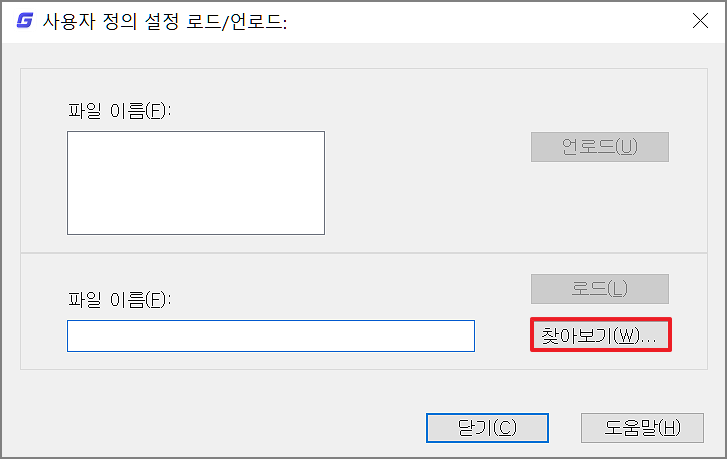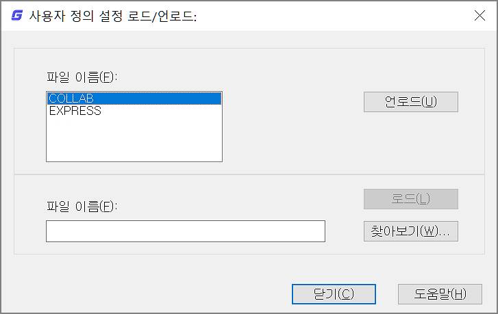 1) 명령어 MENULOAD를 입력하여 “사용자 정의 설정 로드/언로드” 창을 띄웁니다.