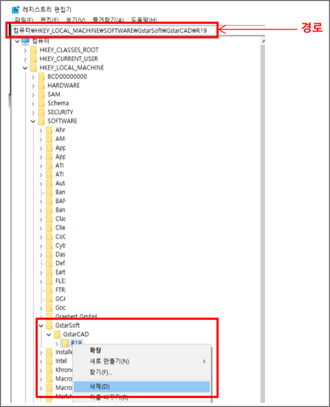 (HKEY_LOCAL_MACHINE에는 Gstarsoft 항목이 없을 수도 있습니다.)